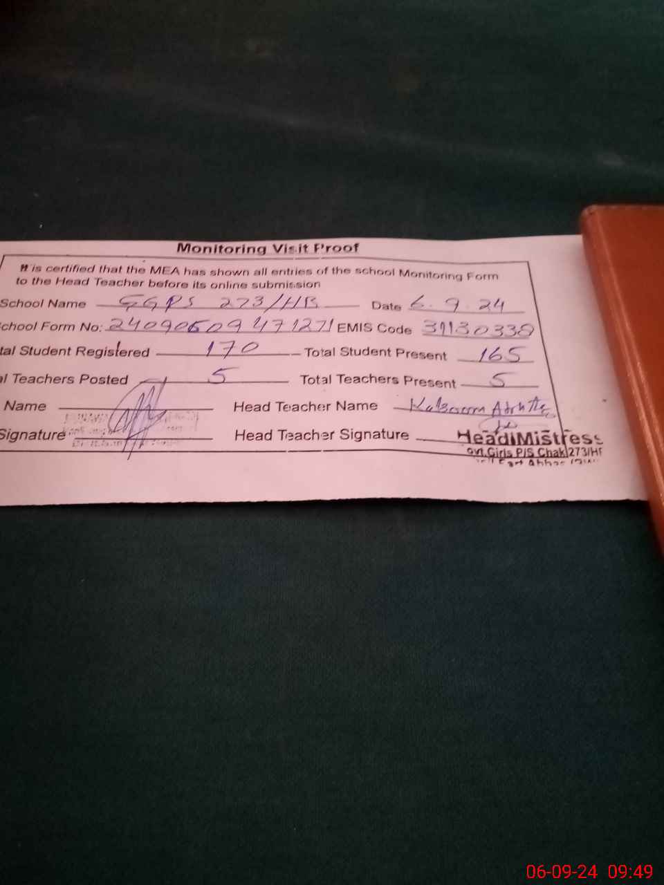 | Attendance Register | Head Teacher | MEA with School | Visit Proof |