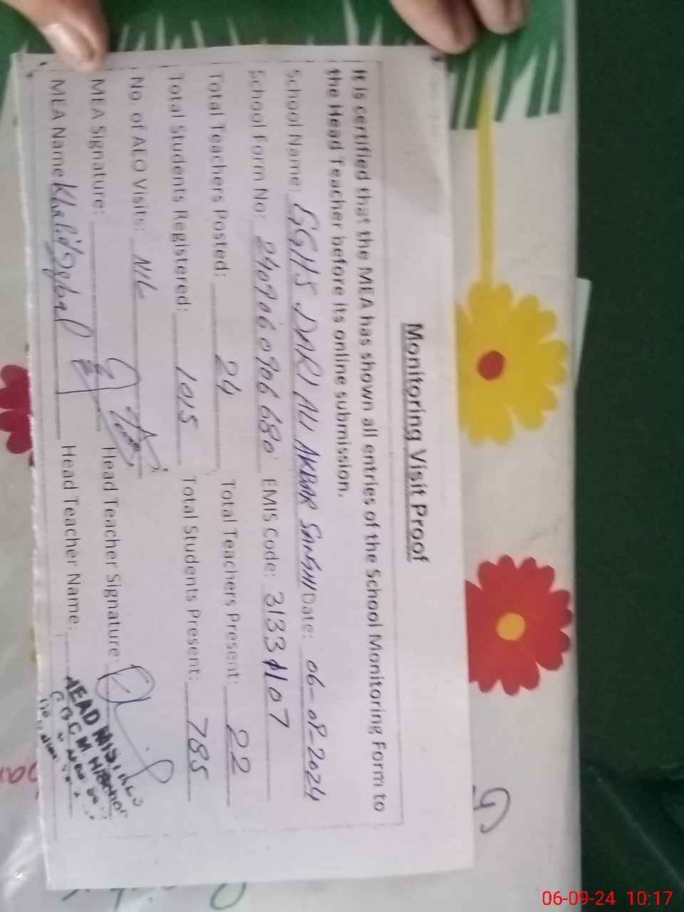 | Certified that this School was Inspected by the Undersigned MEA/DMO Today and the Information Stated Above is as Per Record. | |||||