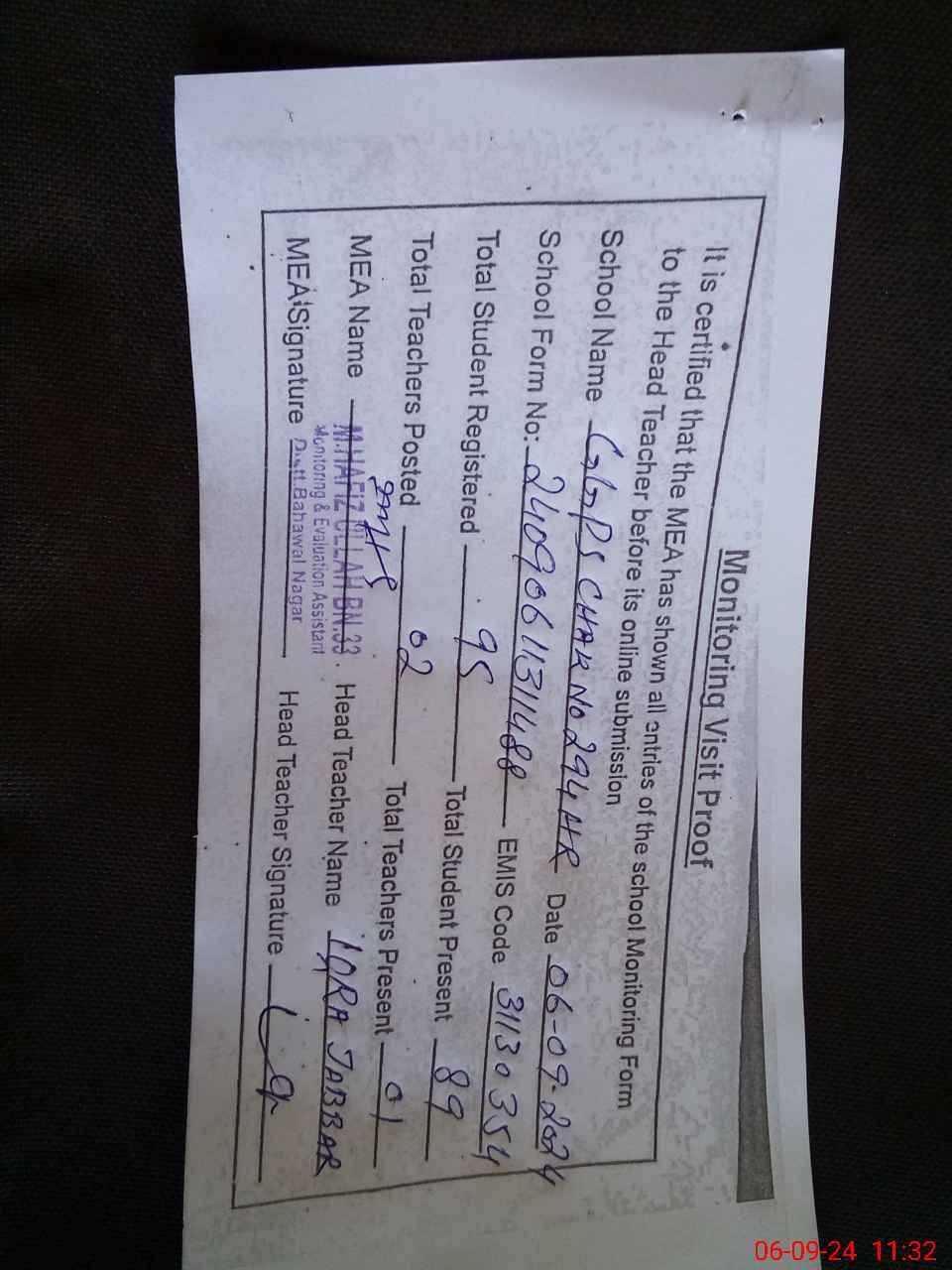 | Attendance Register | Head Teacher | MEA with School | Visit Proof |