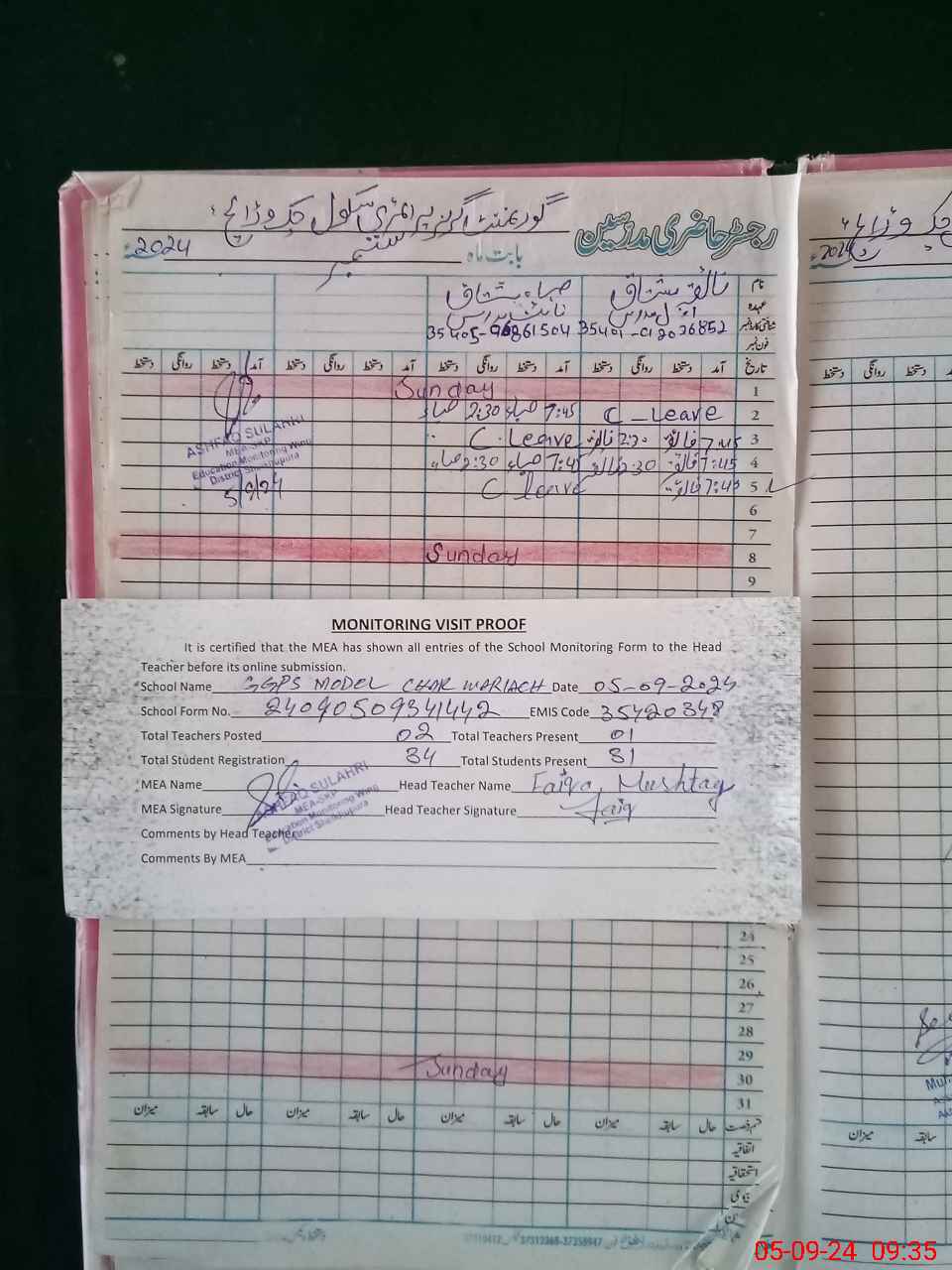 | EMIS Code: 35420348 | Name of School: GGPS MODEL CHAK WARIACH | |||