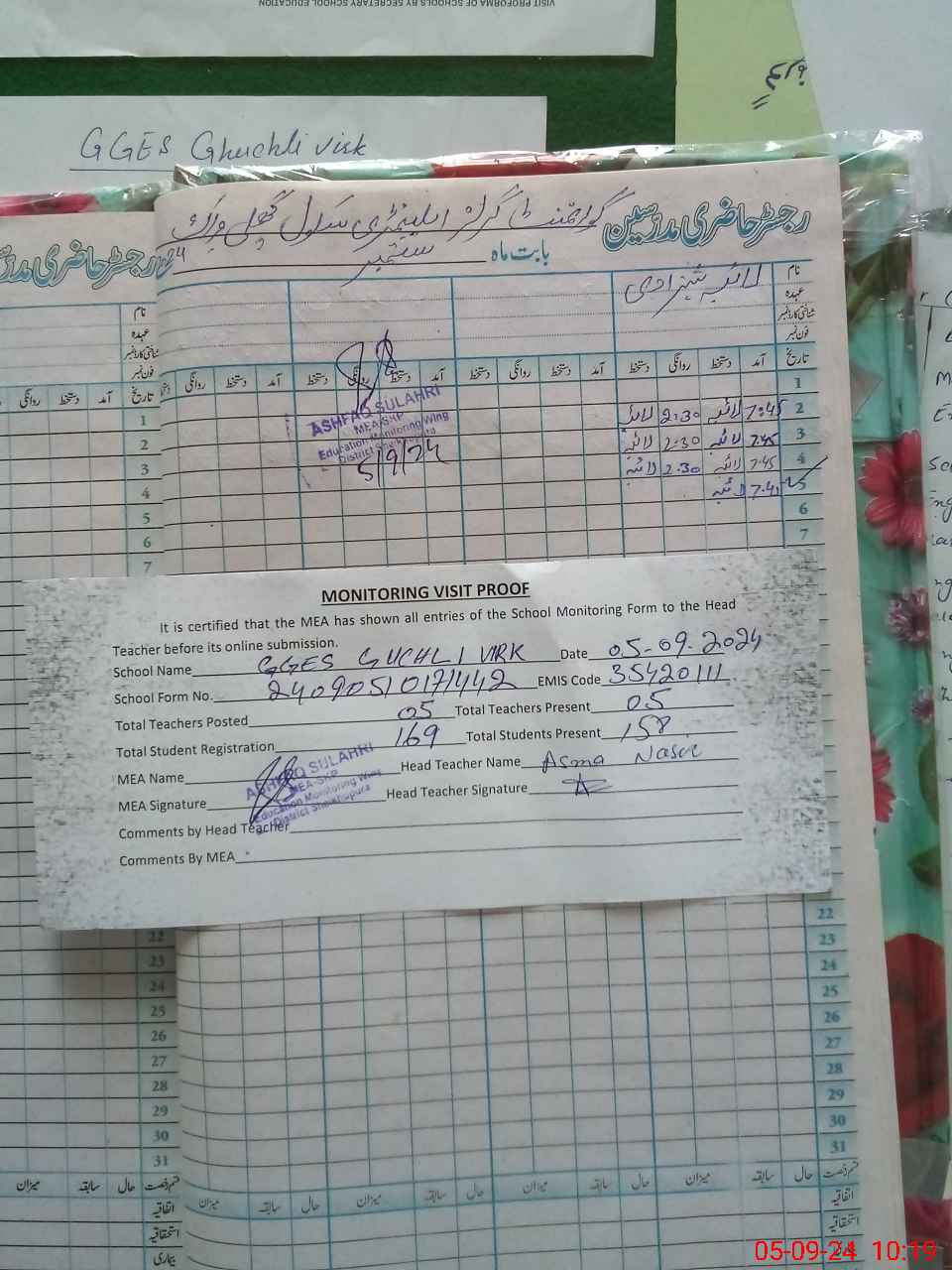| Attendance Register | Head Teacher | MEA with School | Visit Proof |