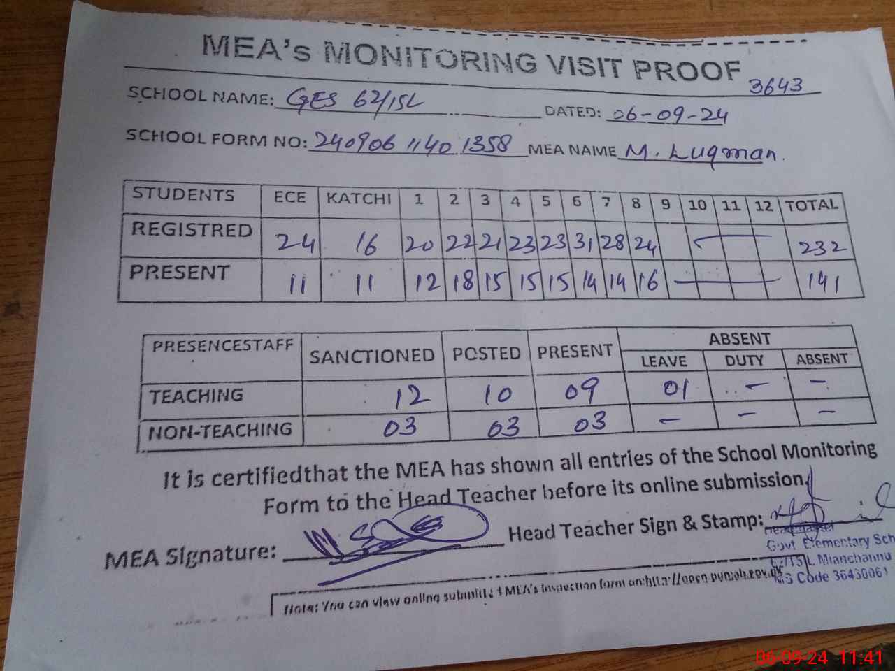 | EMIS Code: 36430061 | Name of School: GES 62/15-L P/O 59-15/L, MIAN CHANNU | |||