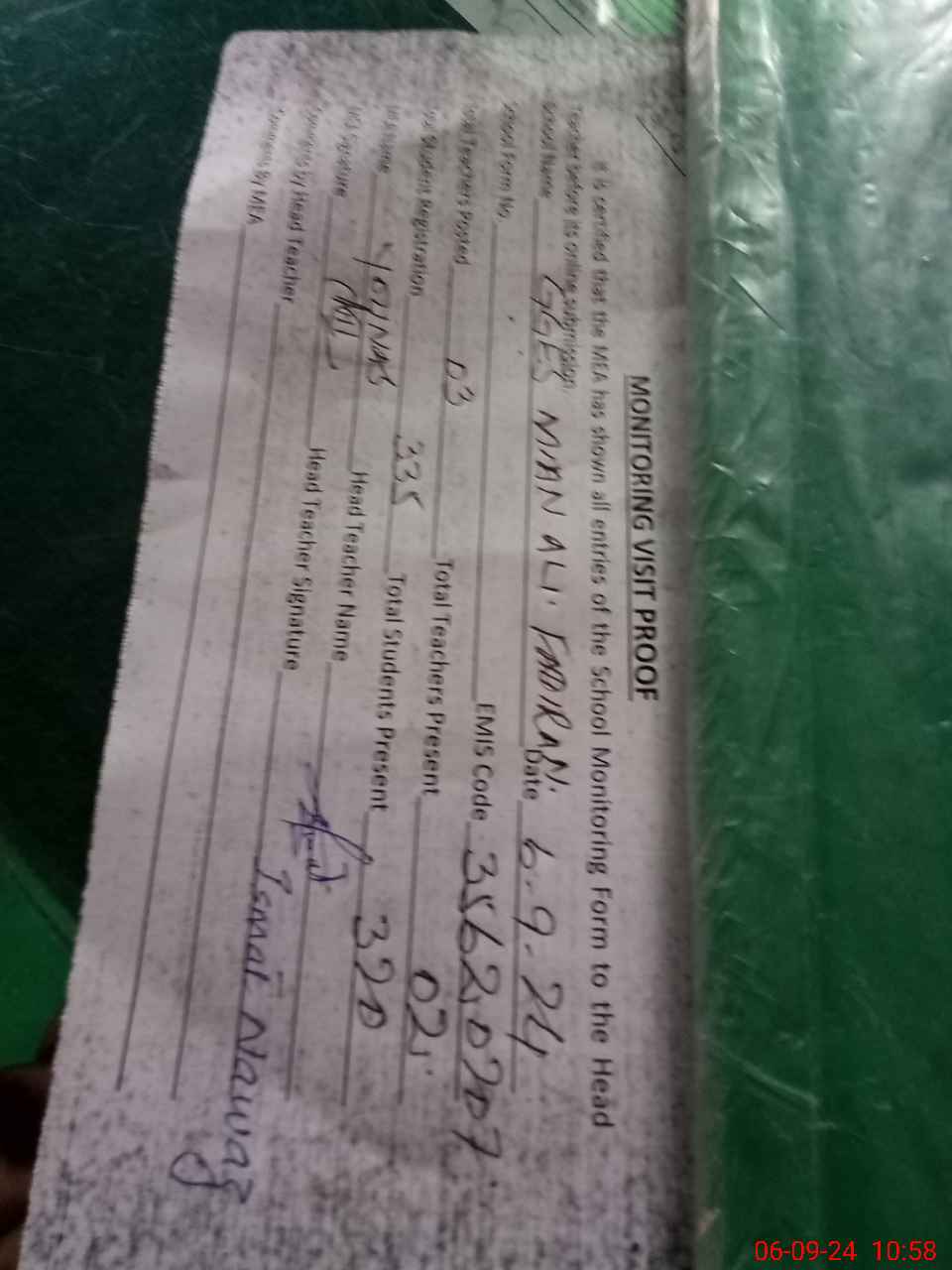 | Attendance Register | Head Teacher | MEA with School | Visit Proof |
