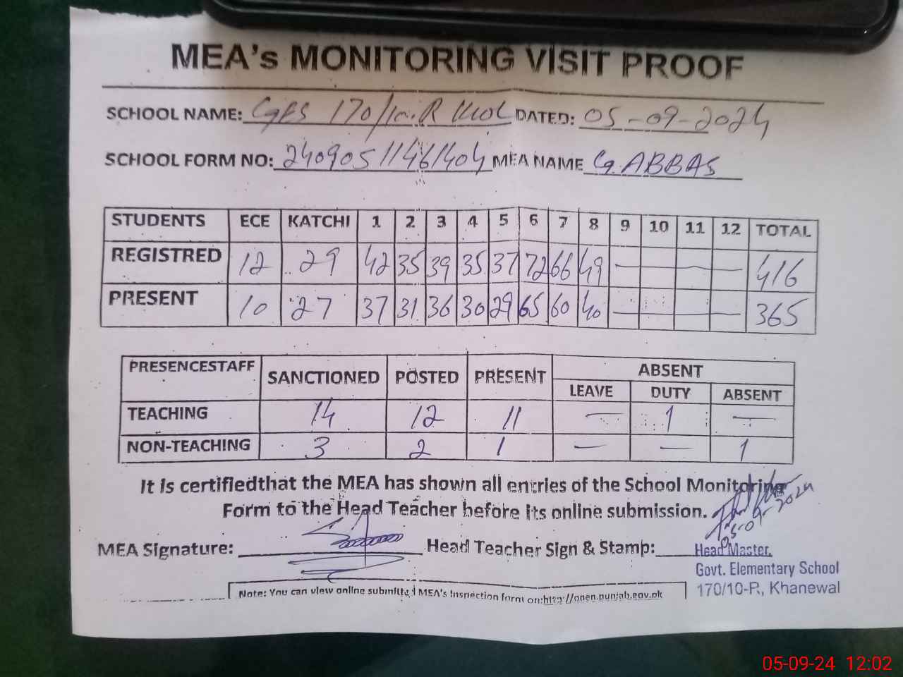 | Attendance Register | Head Teacher | MEA with School | Visit Proof |