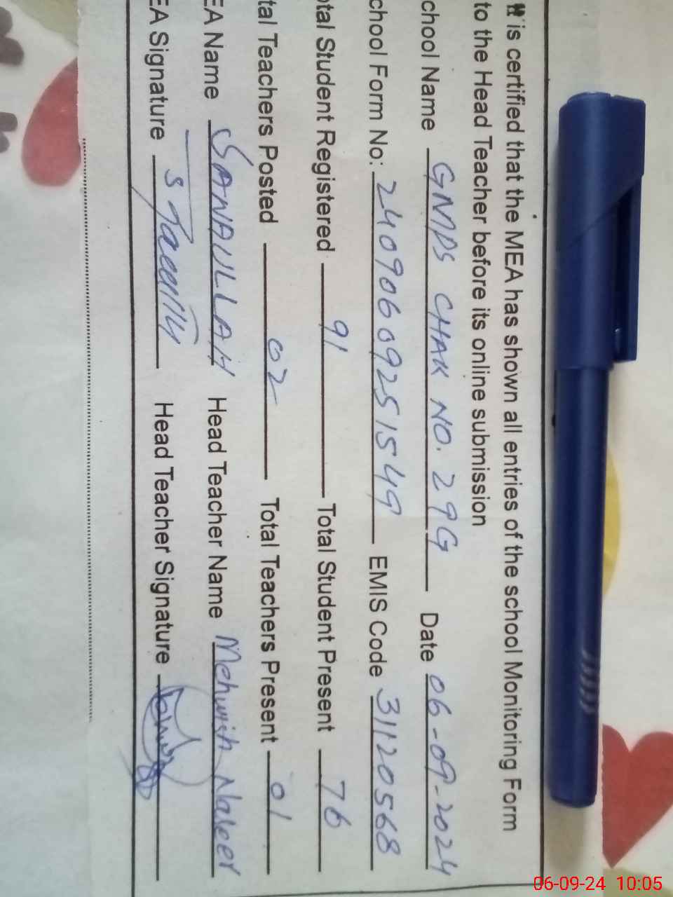 | Name: Me**** Na**** Designation: (School Headmaster's/Headmistress's) PST Phone/Cell Number: 03**** |