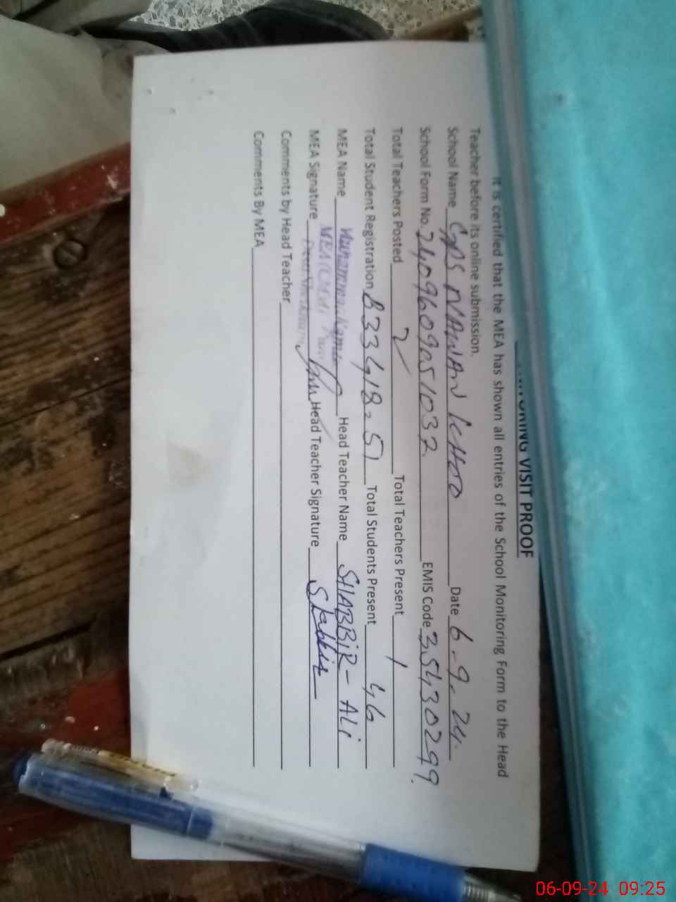 | Attendance Register | Head Teacher | MEA with School | Visit Proof |