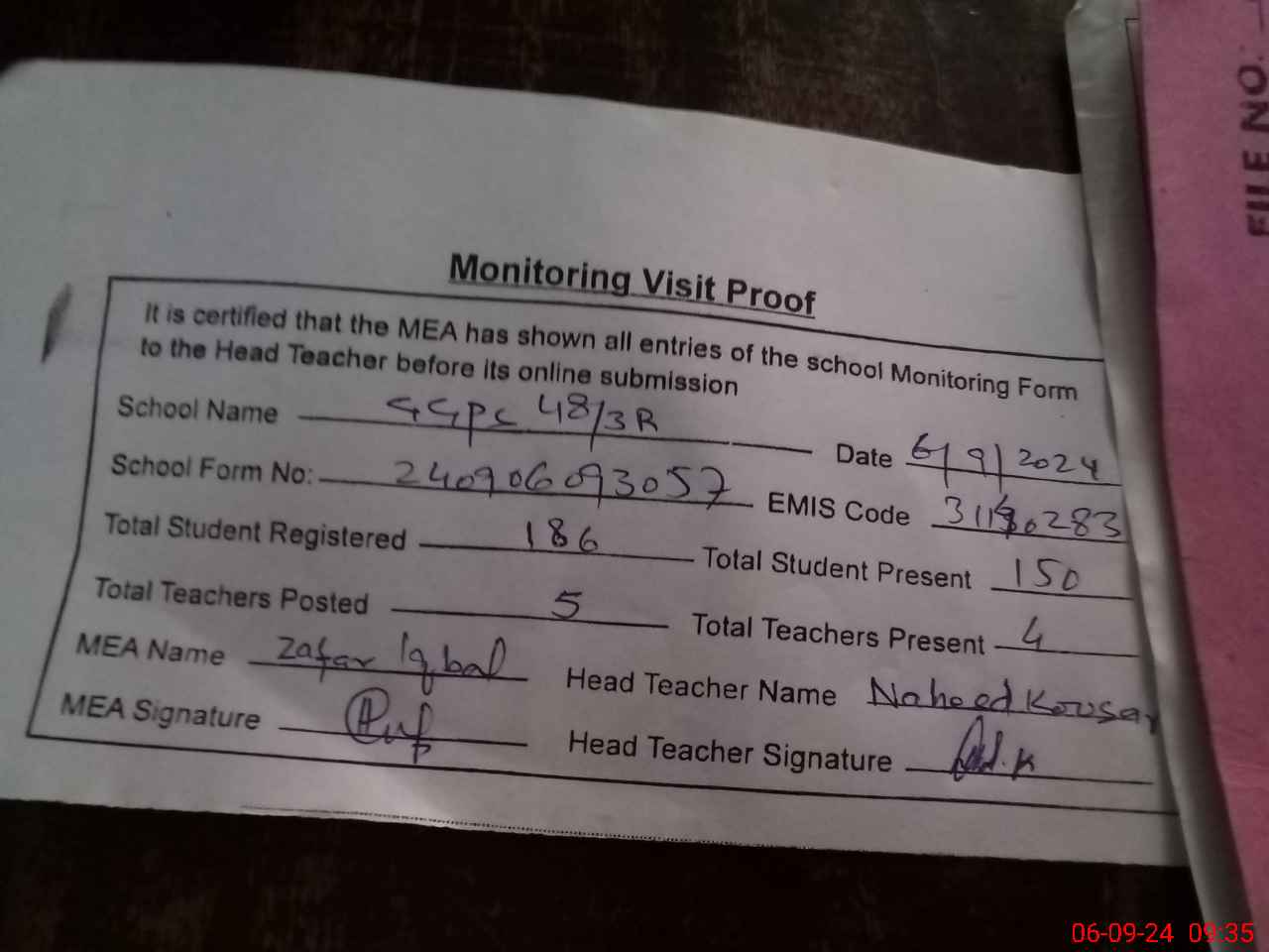 | Certified that this School was Inspected by the Undersigned MEA/DMO Today and the Information Stated Above is as Per Record. | |||||