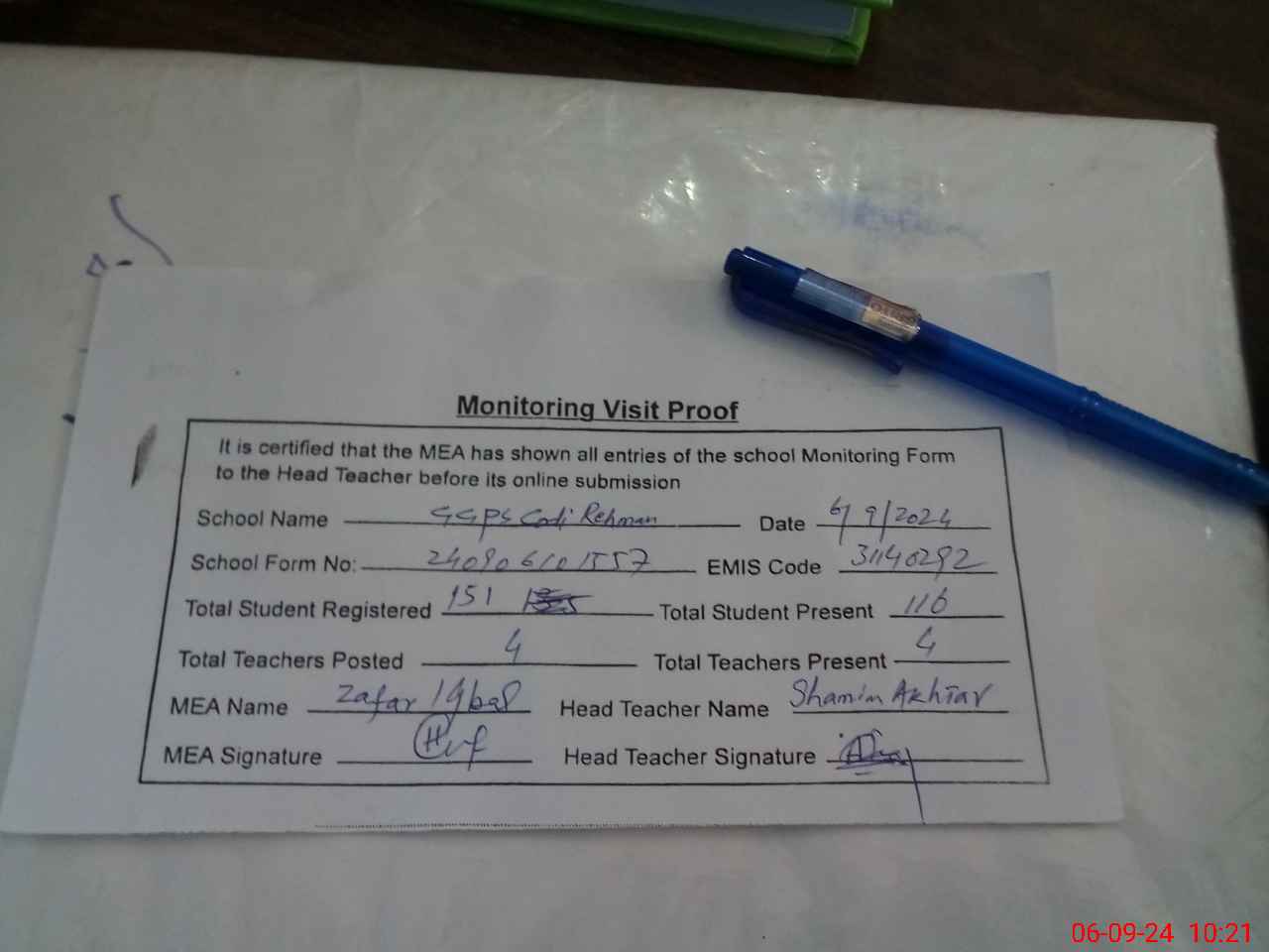 | Attendance Register | Head Teacher | MEA with School | Visit Proof |