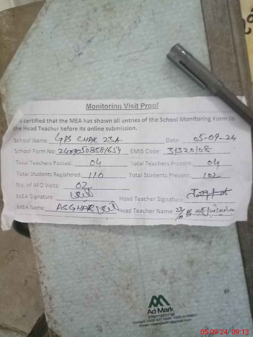| EMIS Code: 31320108 | Name of School: GPS CHAK 23 A | |||
