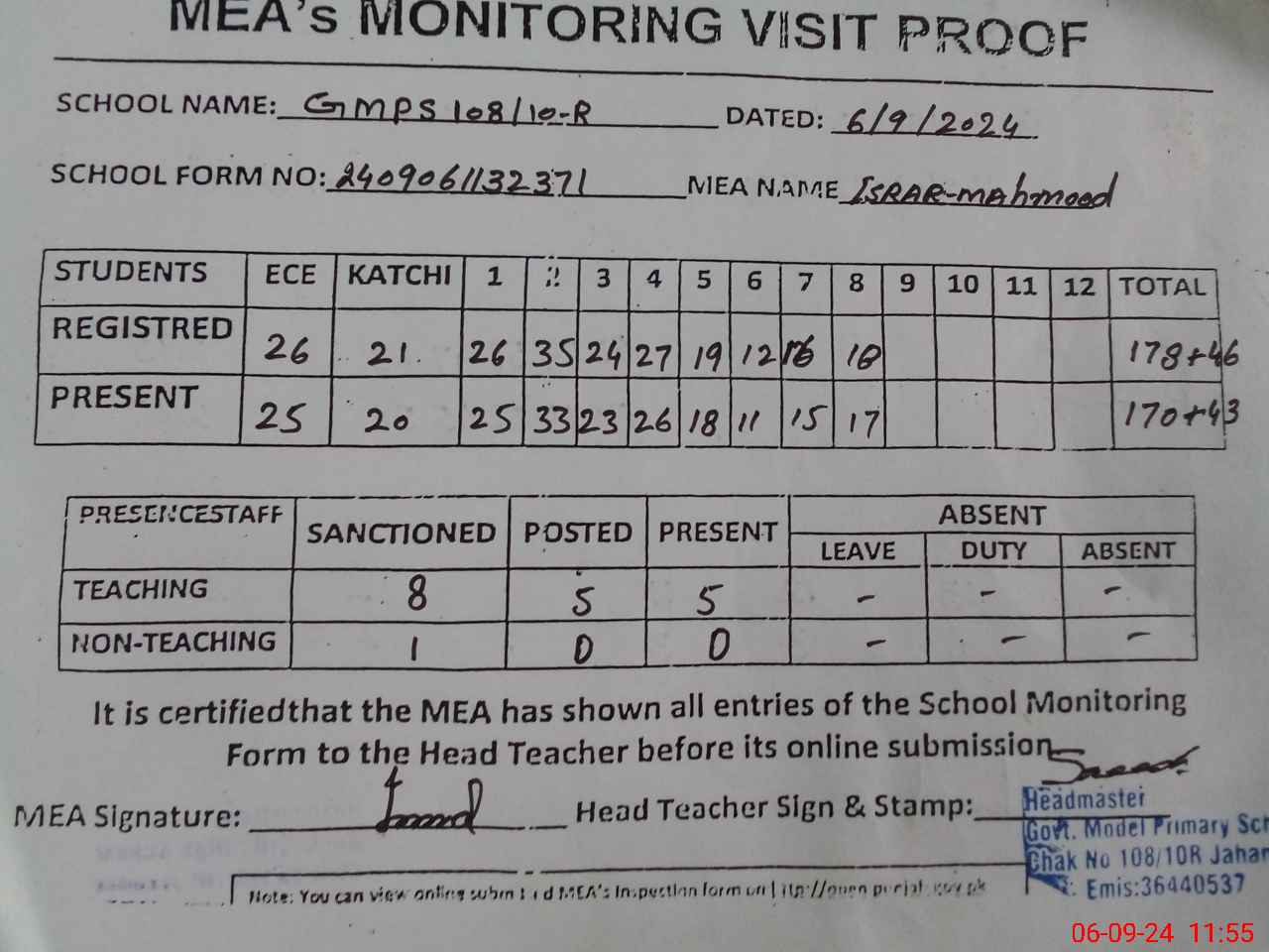 | Certified that this School was Inspected by the Undersigned MEA/DMO Today and the Information Stated Above is as Per Record. | |||||