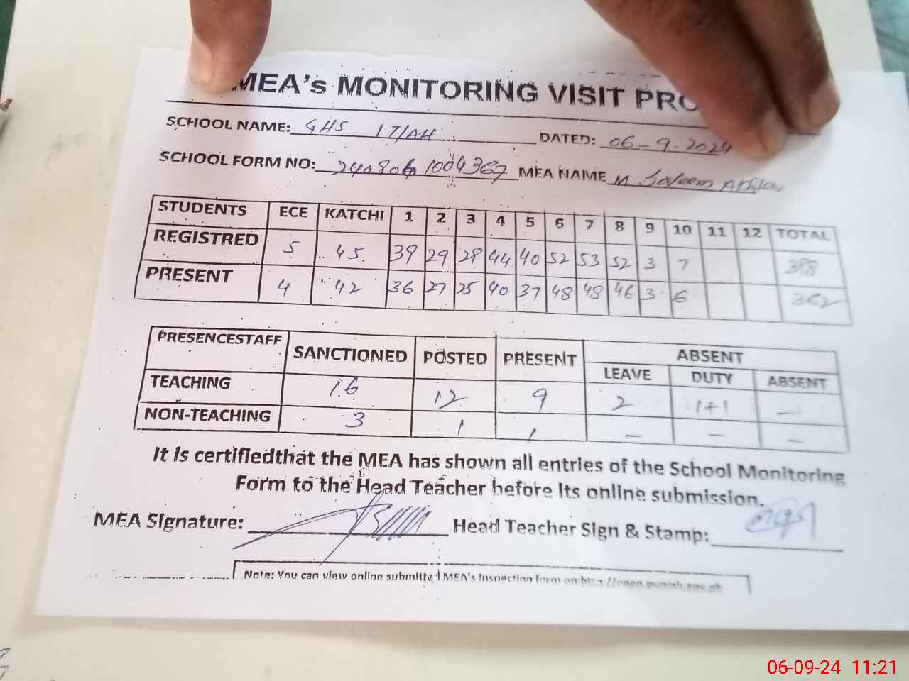 | Attendance Register | Head Teacher | MEA with School | Visit Proof |