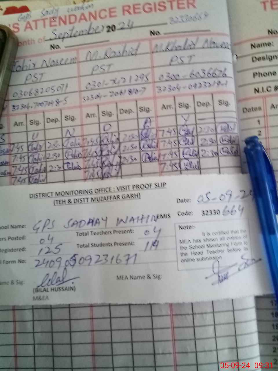 | Attendance Register | Head Teacher | MEA with School | Visit Proof |
