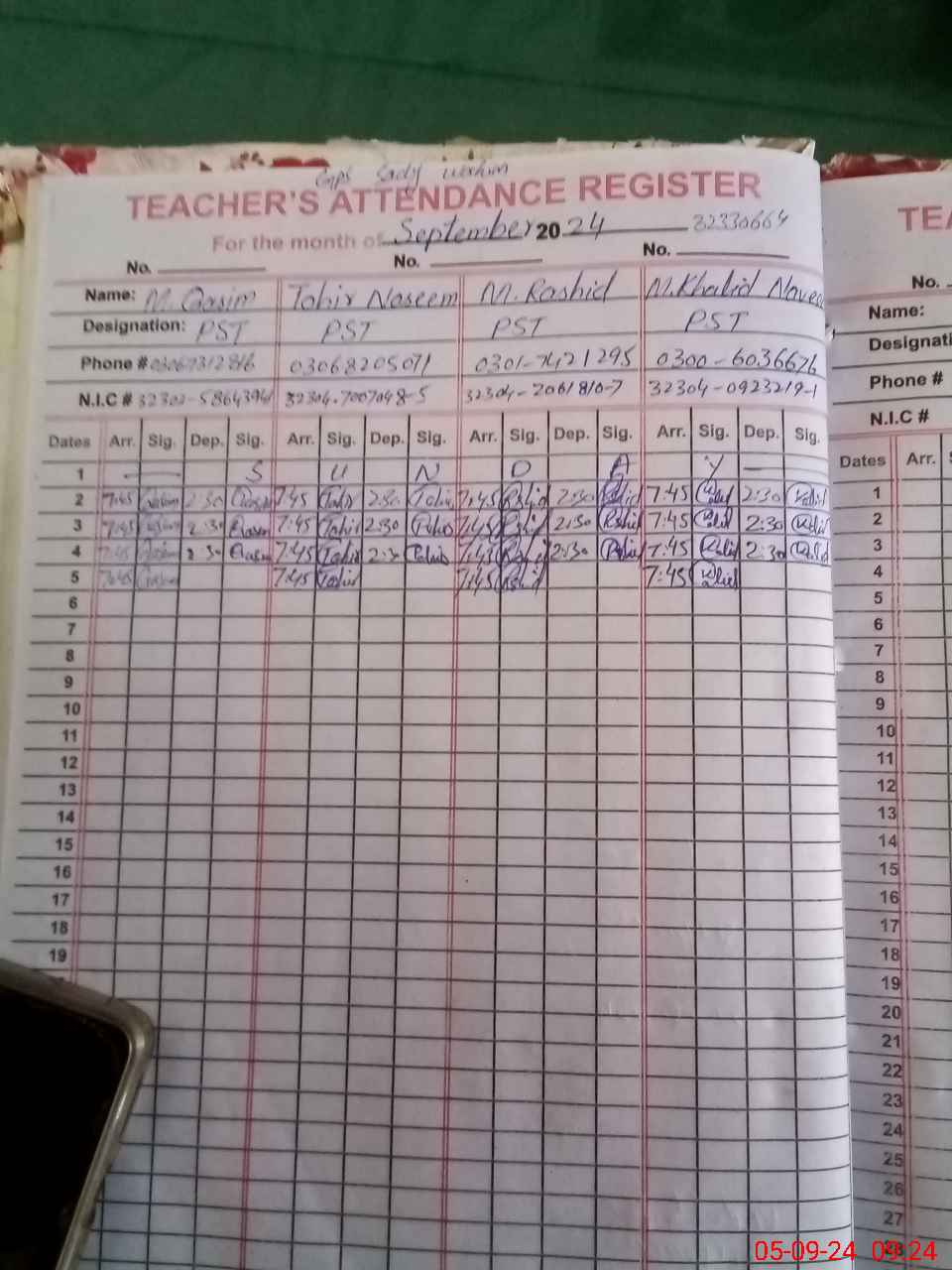 | Name: M.**** Designation: (School Headmaster's/Headmistress's) PST Phone/Cell Number: 03**** |