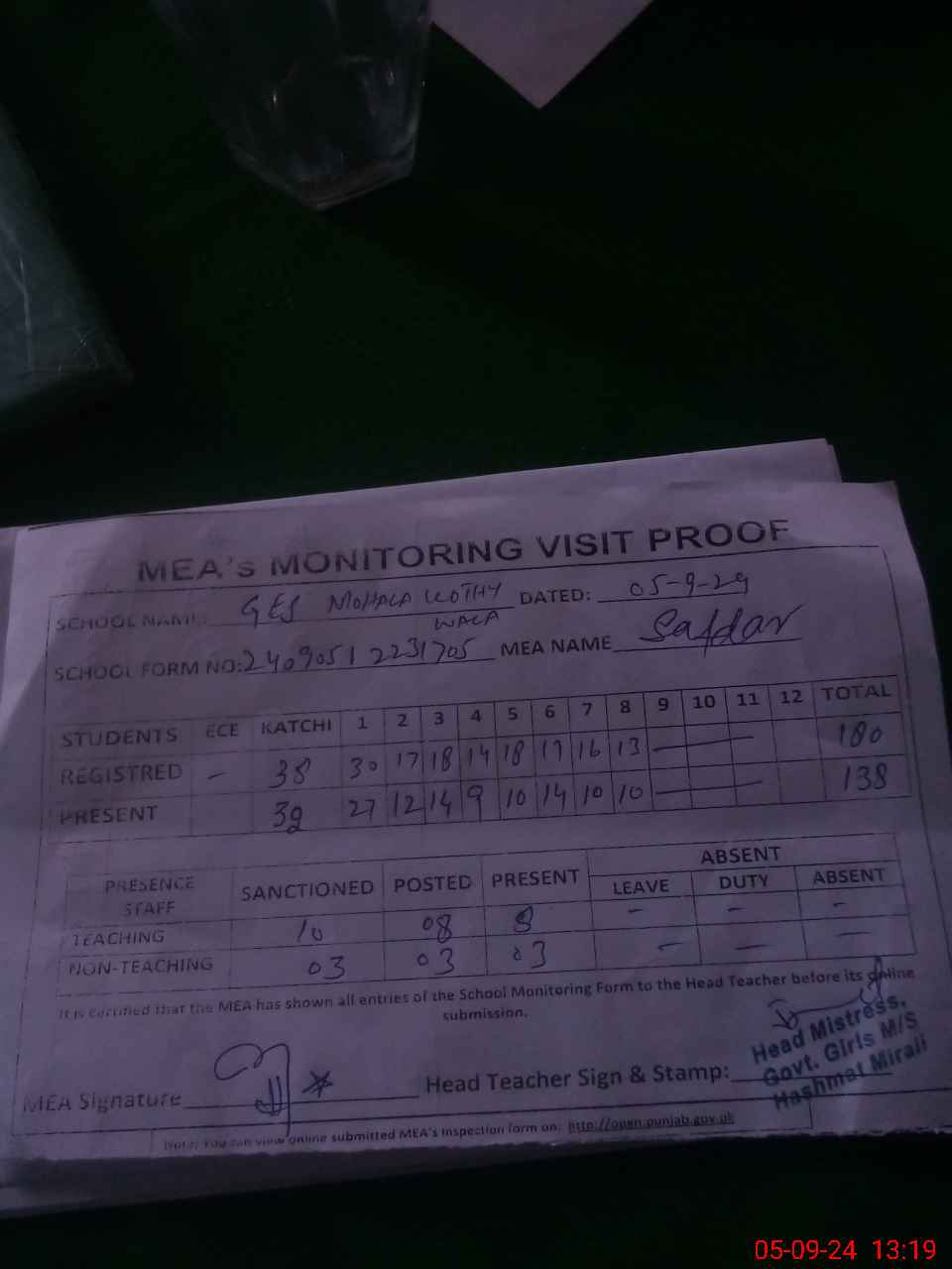 | Attendance Register | Head Teacher | MEA with School | Visit Proof |