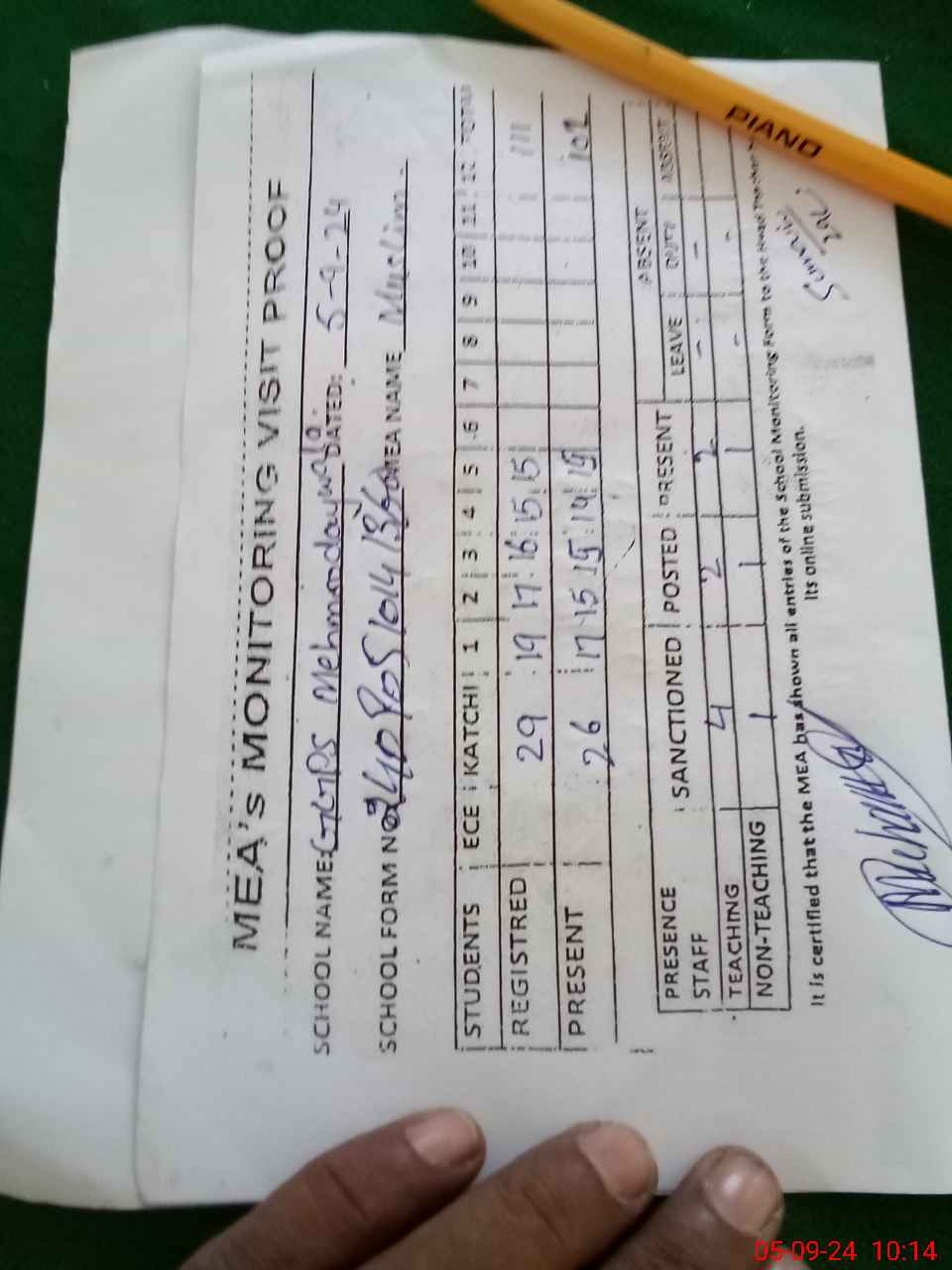 | Attendance Register | Head Teacher | MEA with School | Visit Proof |