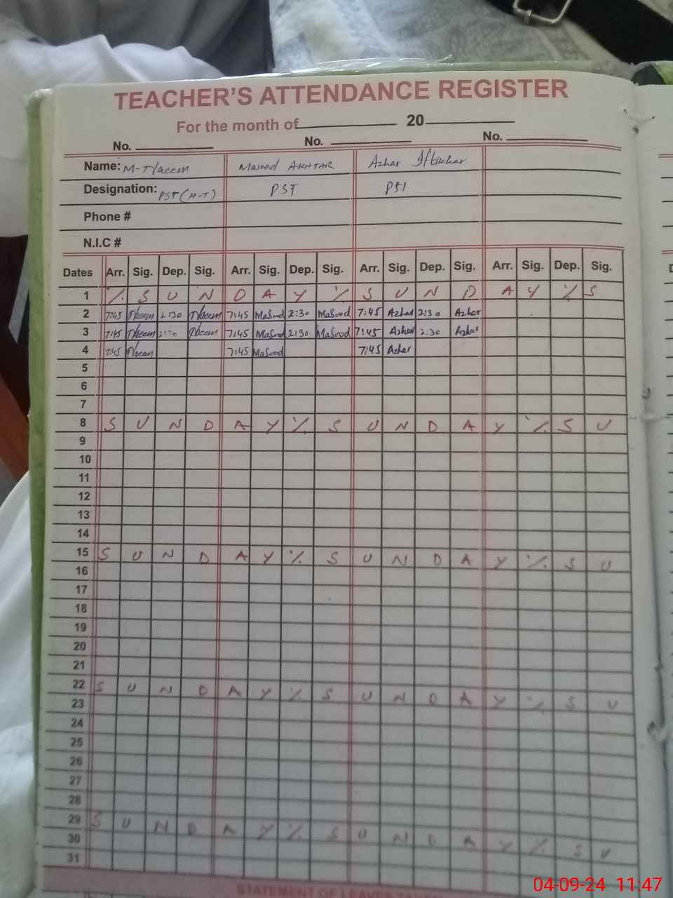 | Name: Mu**** Na**** Designation: (School Headmaster's/Headmistress's) PST Phone/Cell Number: 03**** |
