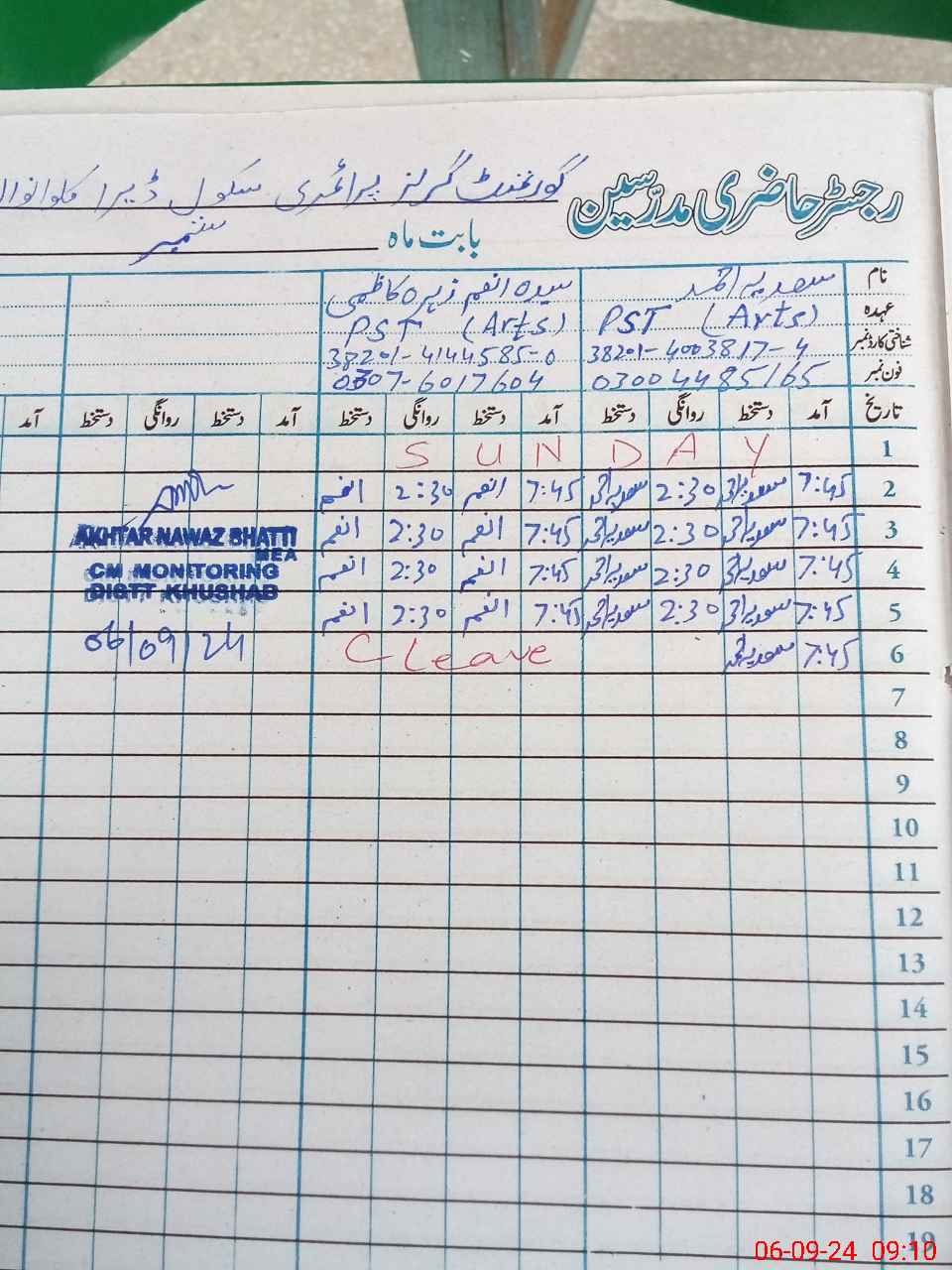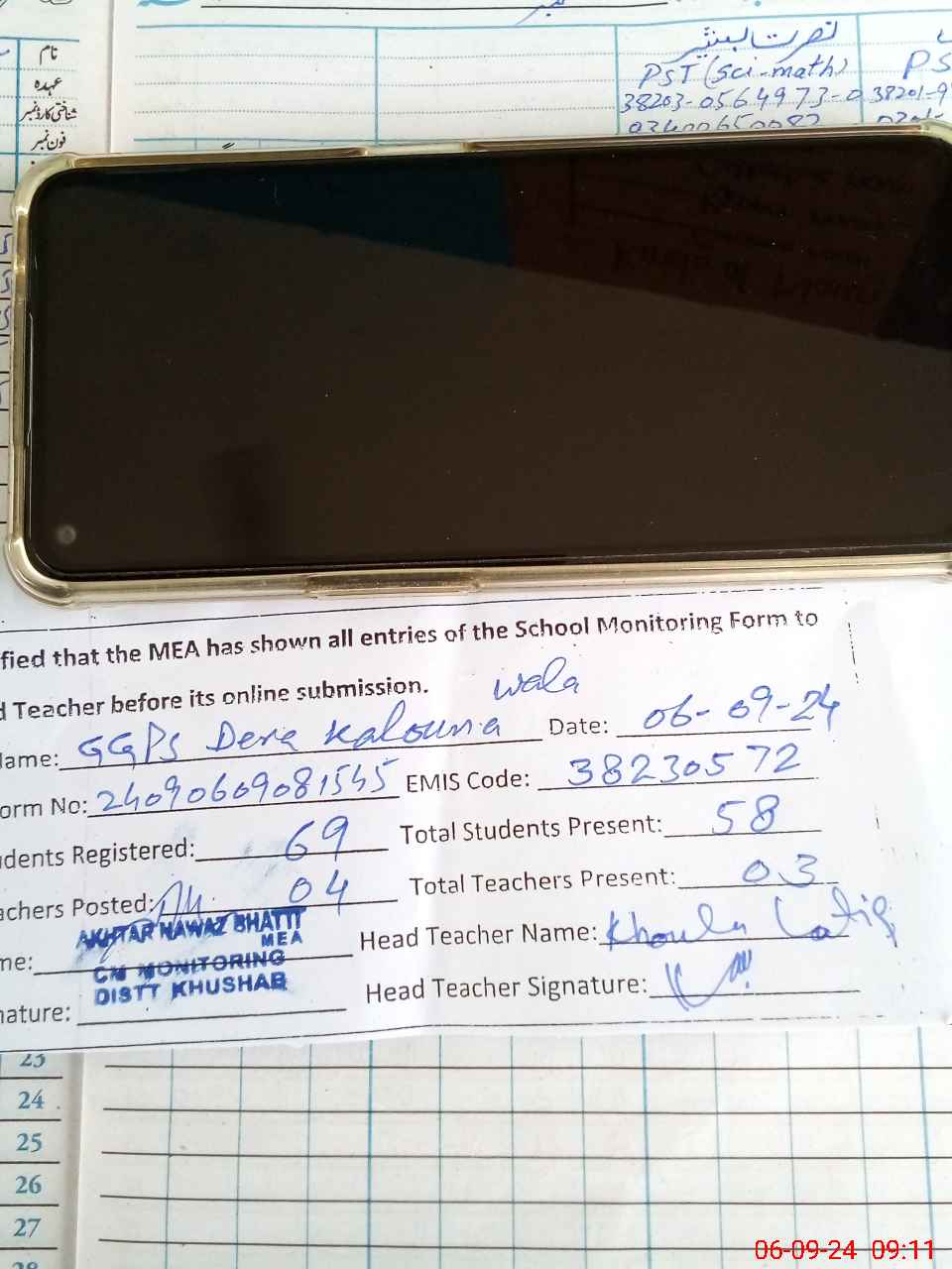 | Name: Kh**** La**** Designation: (School Headmaster's/Headmistress's) PST/PTC/JV Phone/Cell Number: 03**** |