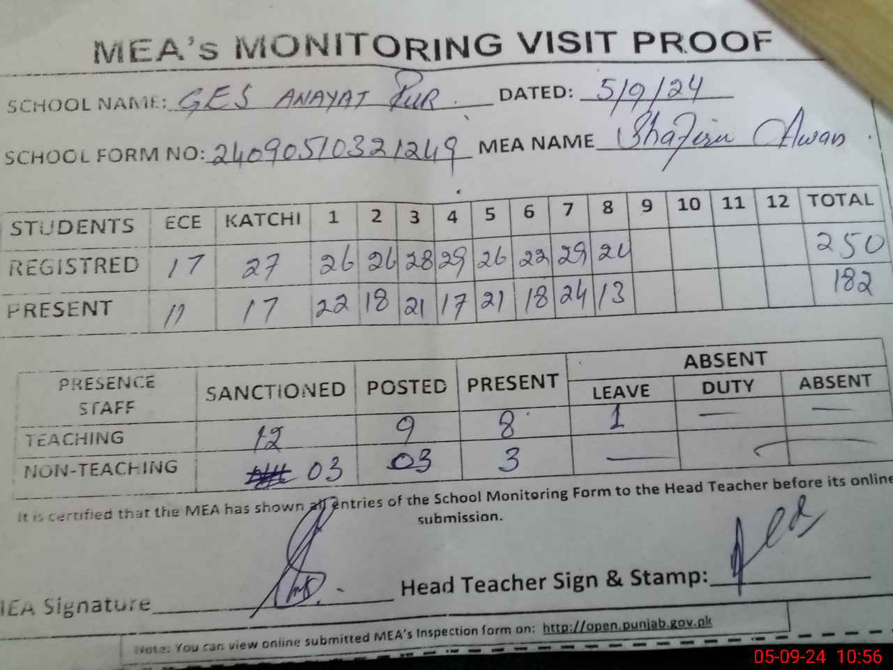 | Attendance Register | Head Teacher | MEA with School | Visit Proof |