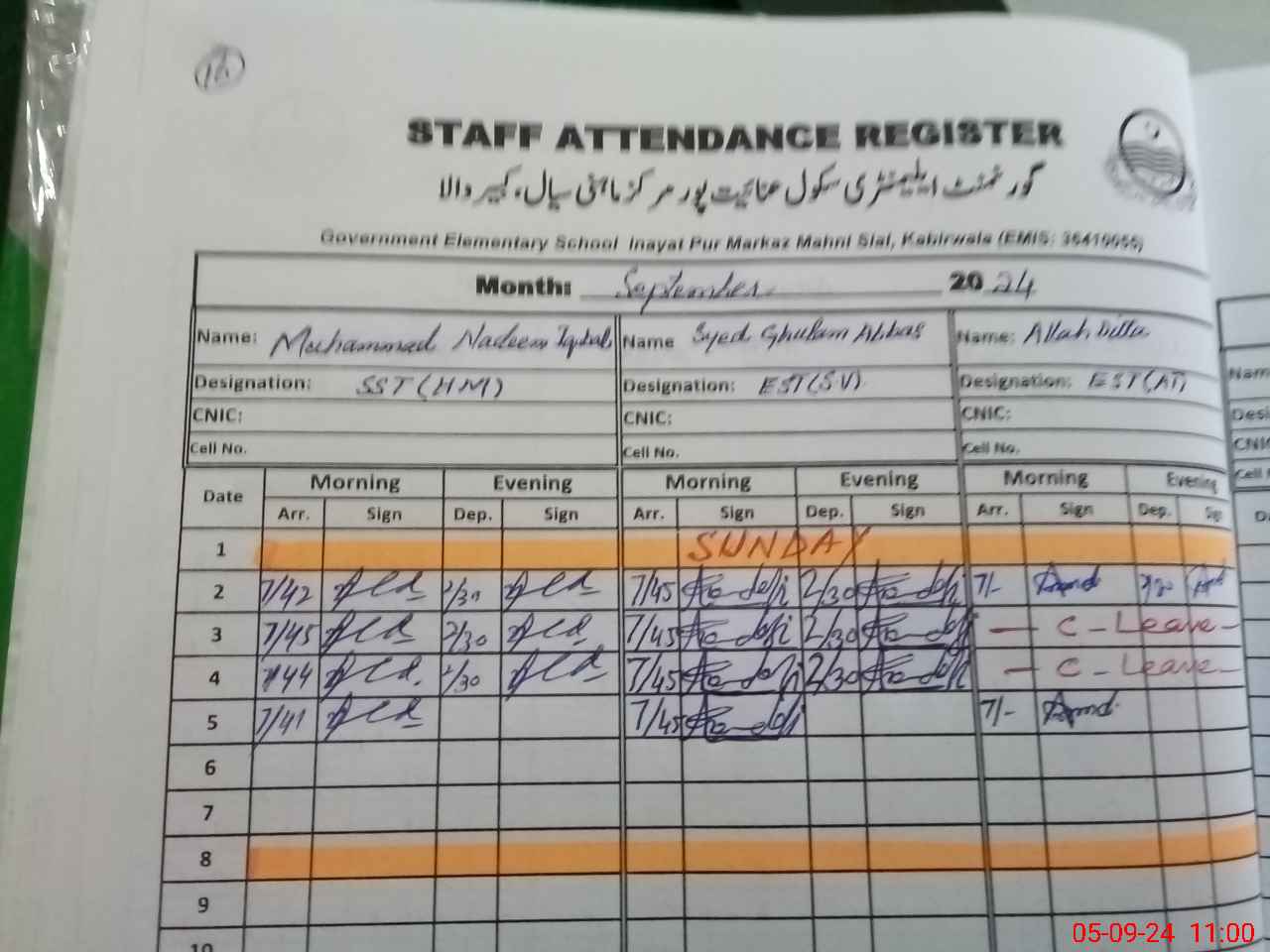 | CNIC | Full Name | Designation | R/C | Absence During Last Calender Month |
