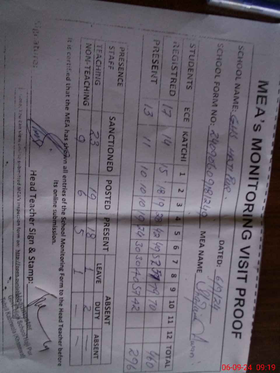 | Attendance Register | Head Teacher | MEA with School | Visit Proof |