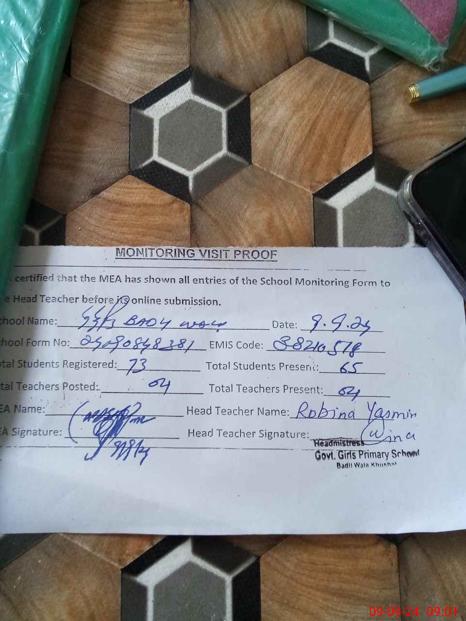 | Attendance Register | Head Teacher | MEA with School | Visit Proof |
