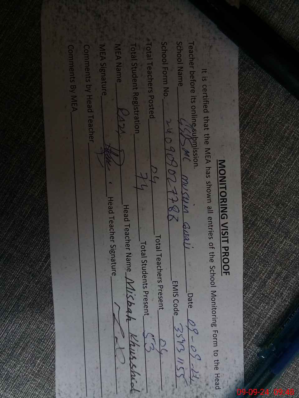 | Attendance Register | Head Teacher | MEA with School | Visit Proof |