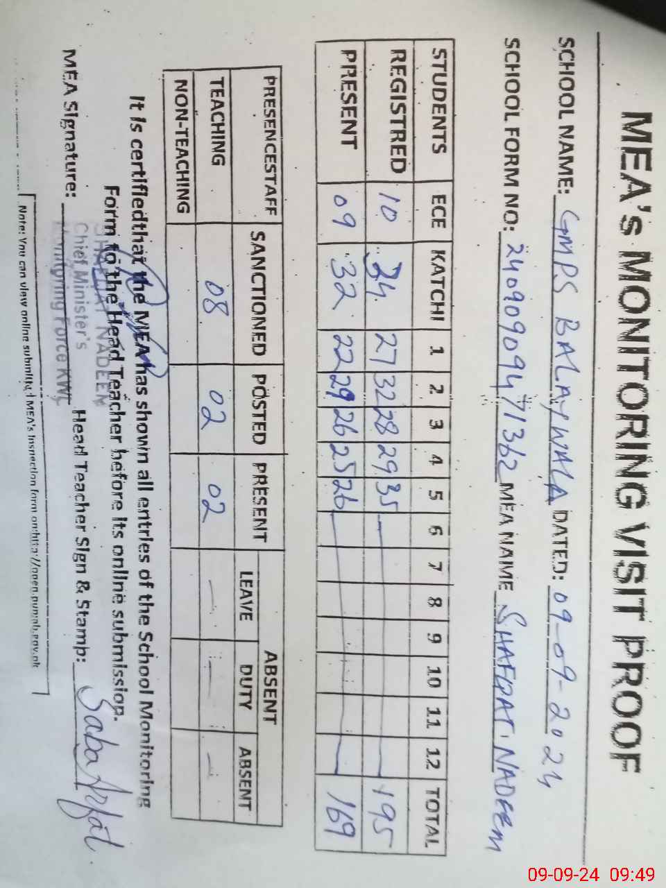 | Attendance Register | Head Teacher | MEA with School | Visit Proof |