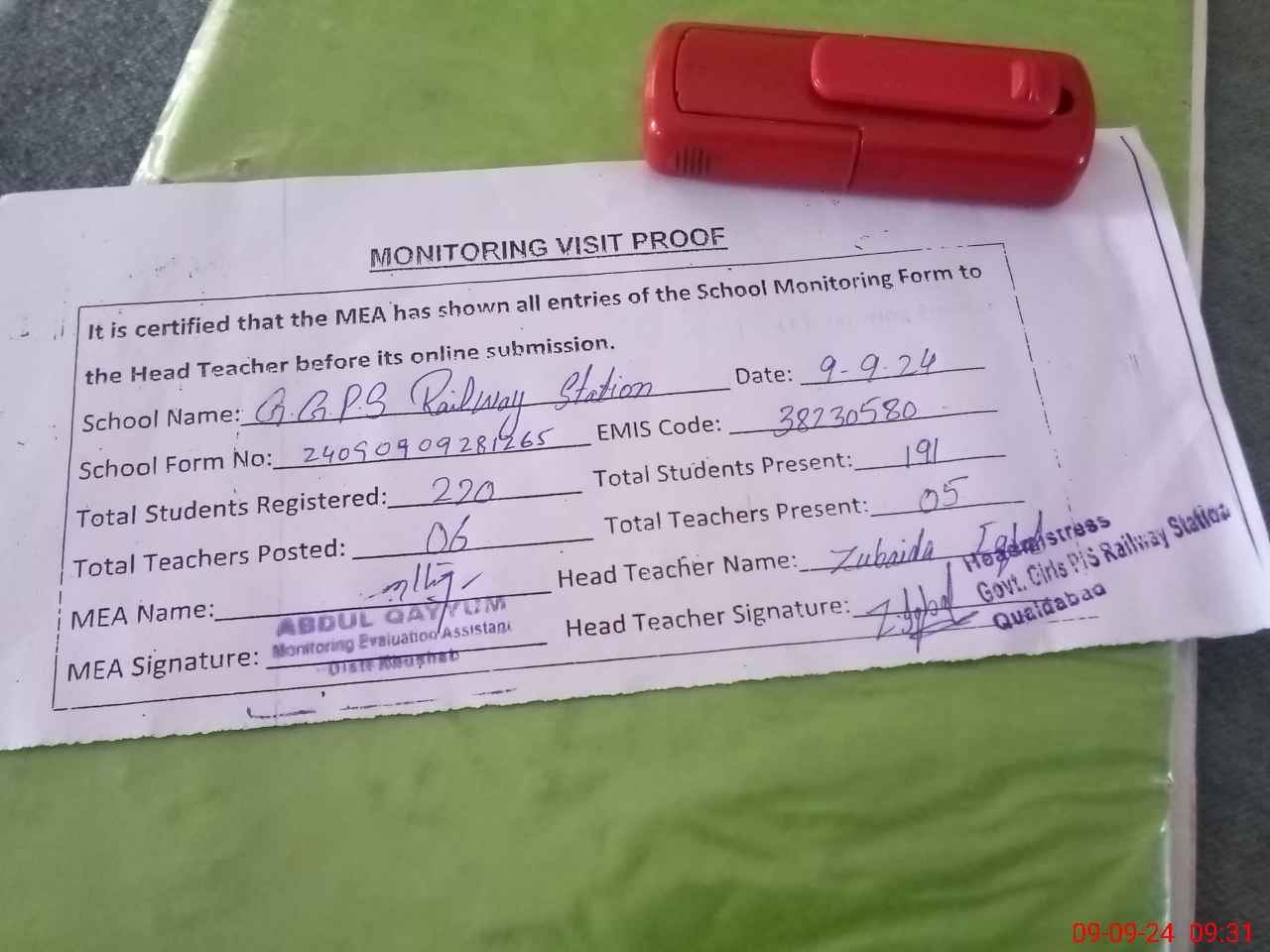 | Attendance Register | Head Teacher | MEA with School | Visit Proof |