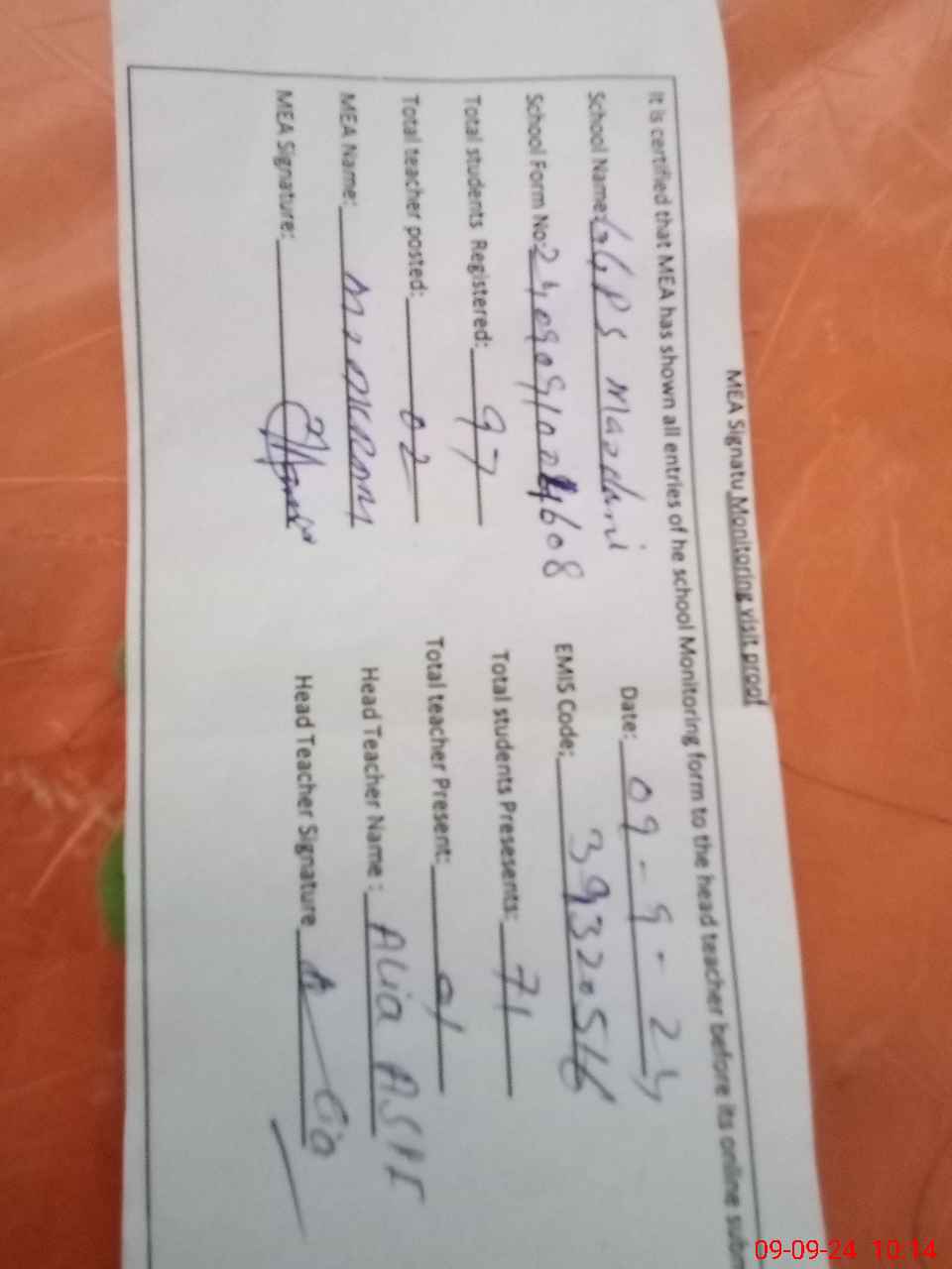 | Certified that this School was Inspected by the Undersigned MEA/DMO Today and the Information Stated Above is as Per Record. | |||||