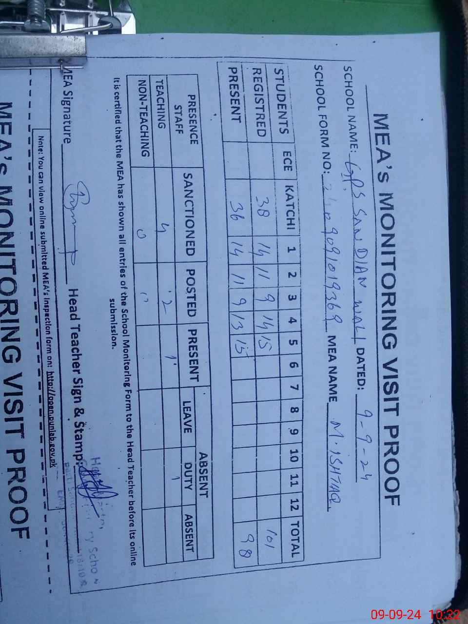 | Attendance Register | Head Teacher | MEA with School | Visit Proof |