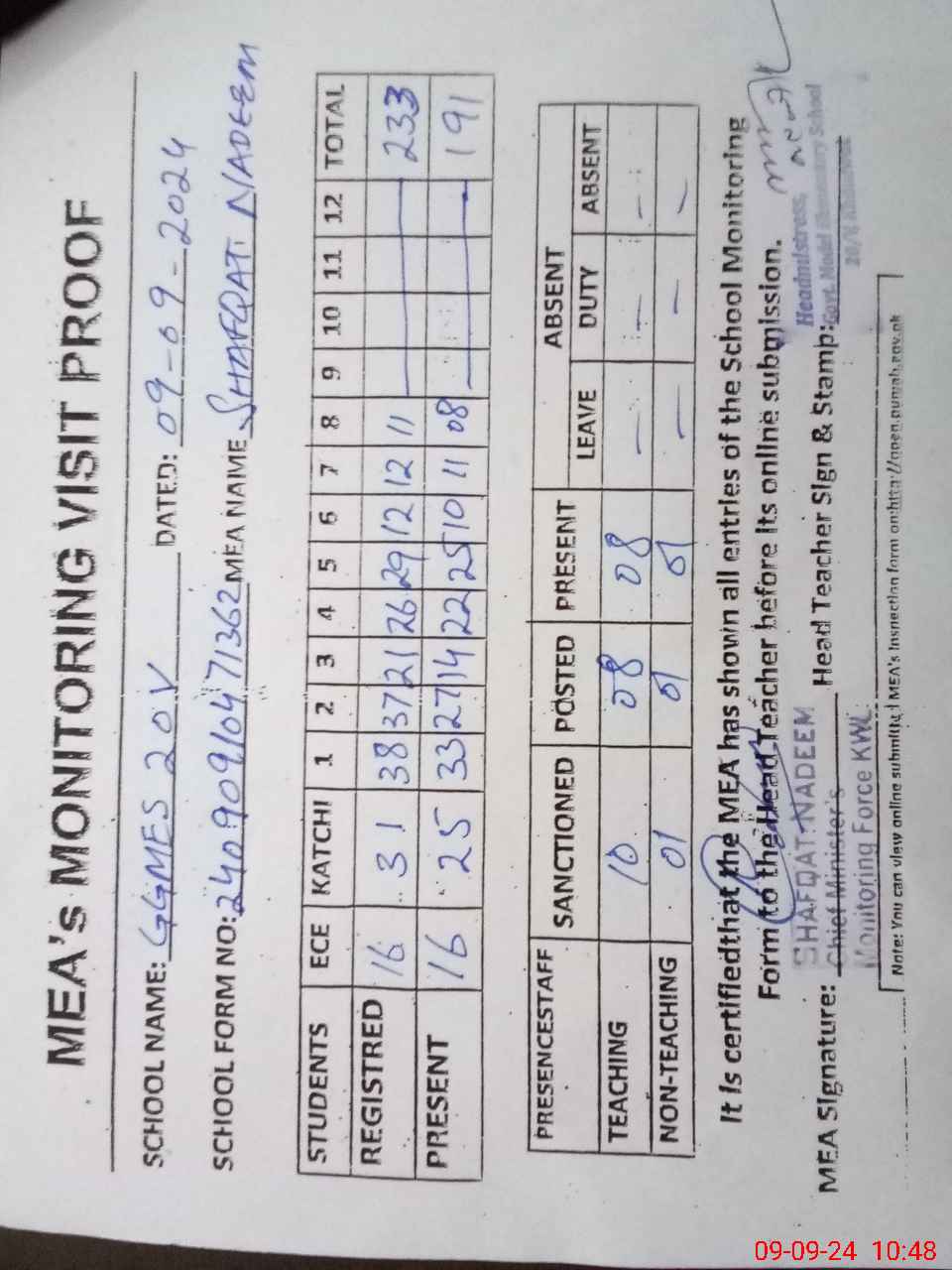 | Certified that this School was Inspected by the Undersigned MEA/DMO Today and the Information Stated Above is as Per Record. | |||||