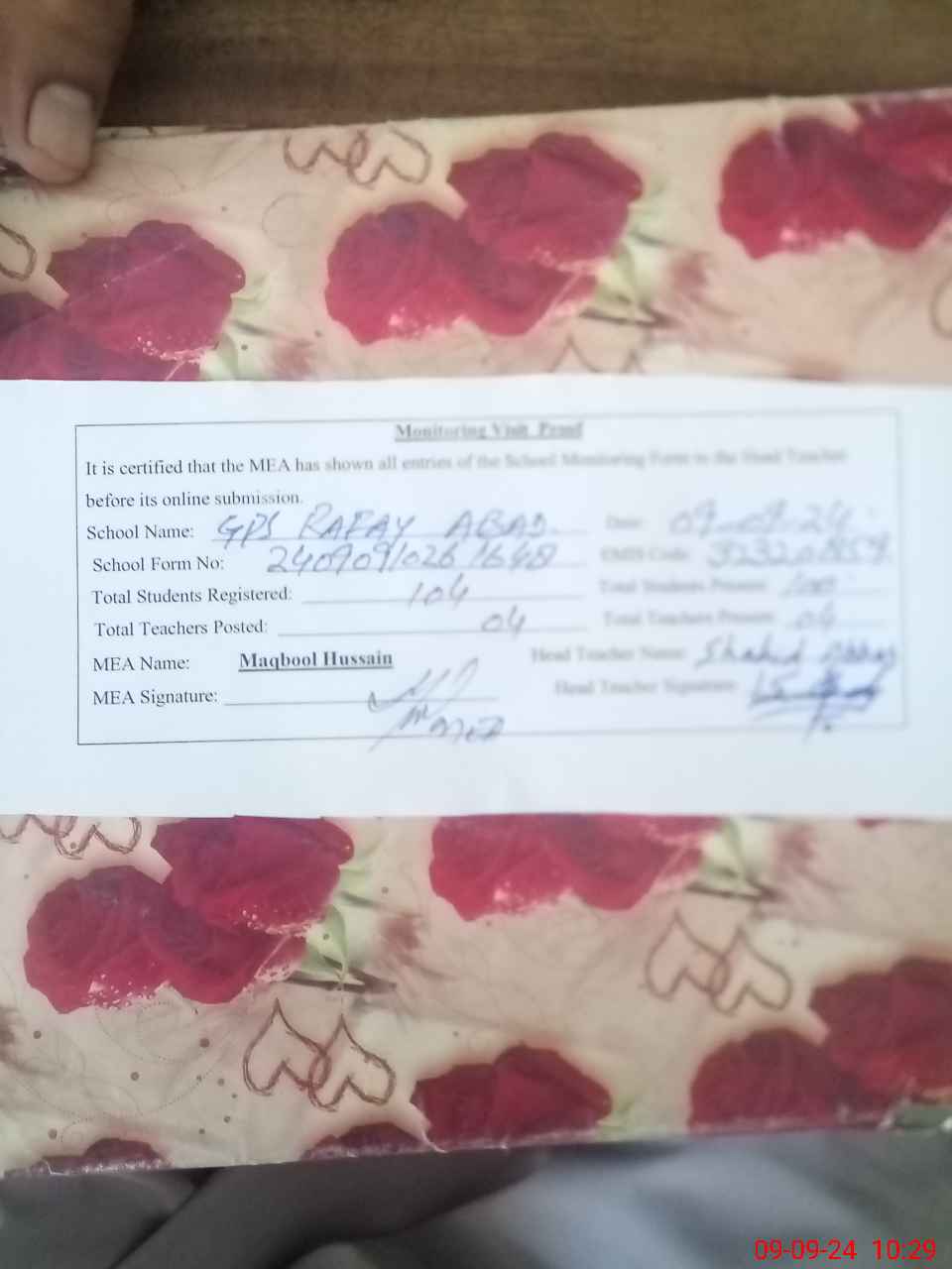 | Attendance Register | Head Teacher | MEA with School | Visit Proof |