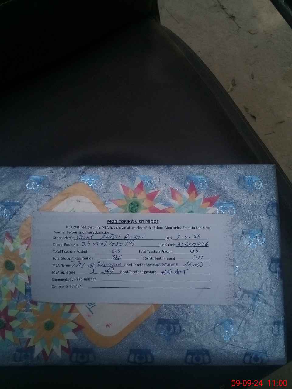 | Attendance Register | Head Teacher | MEA with School | Visit Proof |
