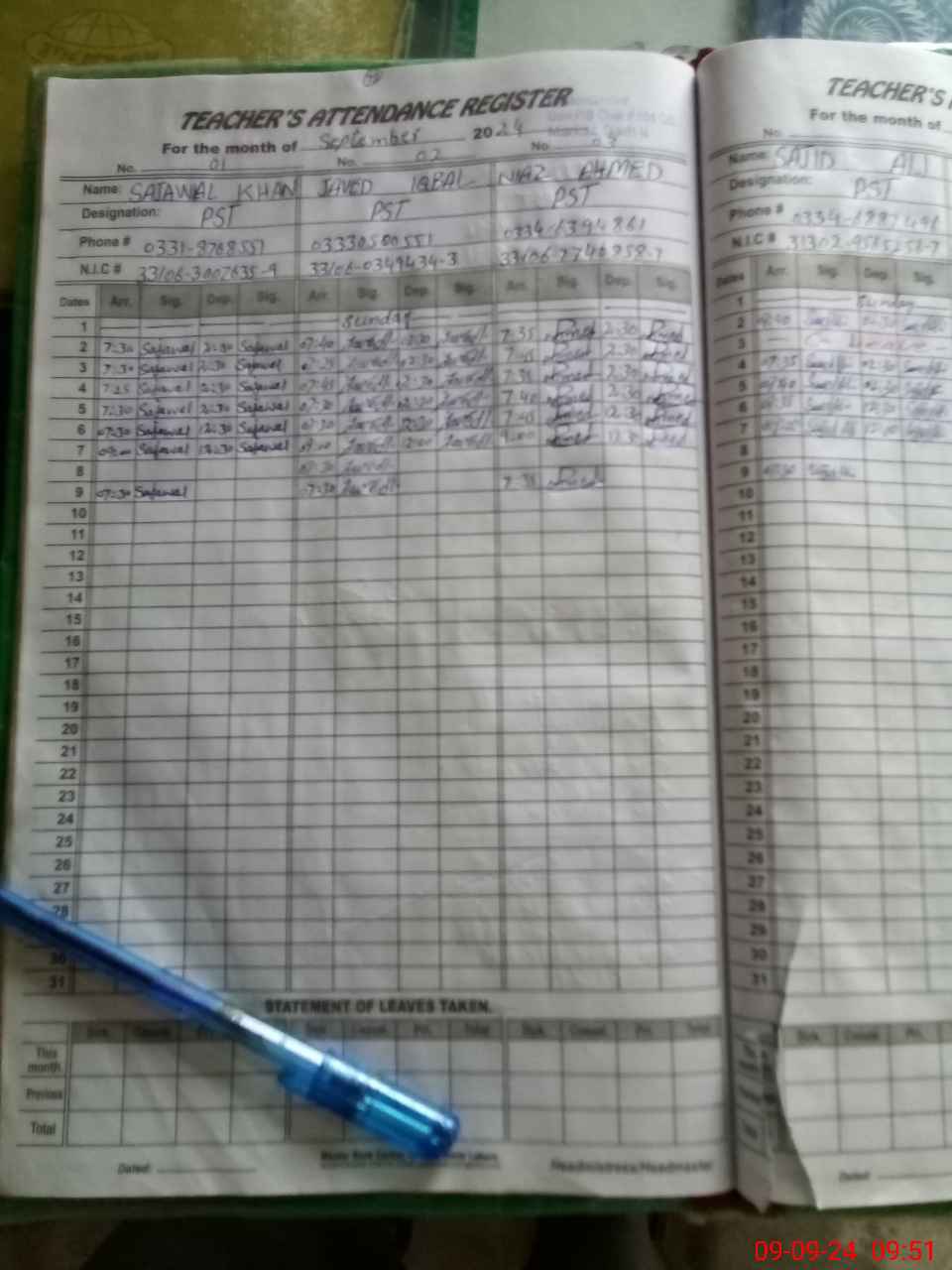 | Name: SA**** KH**** Designation: (School Headmaster's/Headmistress's) PST Phone/Cell Number: 03**** |