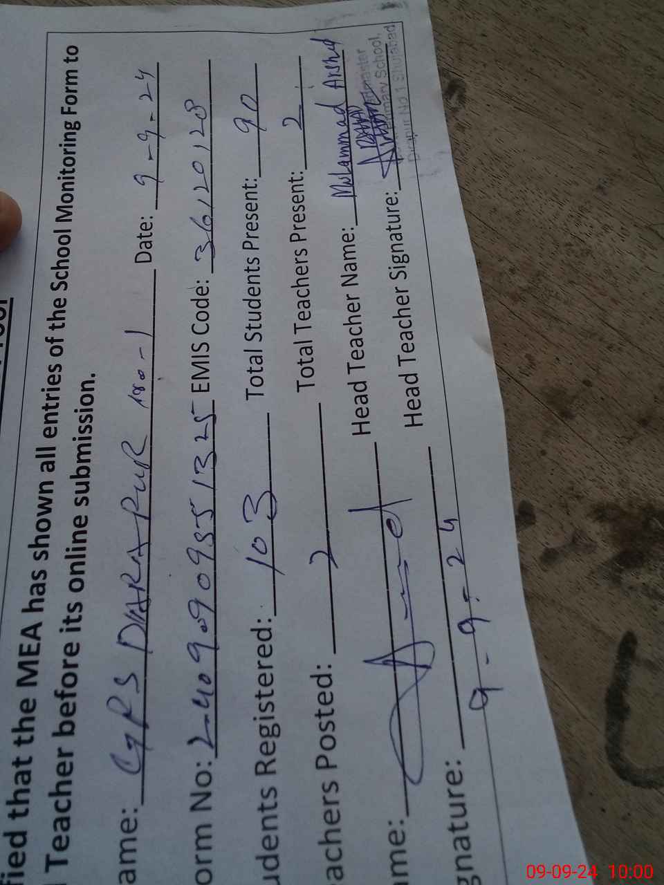 | Name: Mu**** Ar**** Designation: (School Headmaster's/Headmistress's) Pst Phone/Cell Number: 03**** |