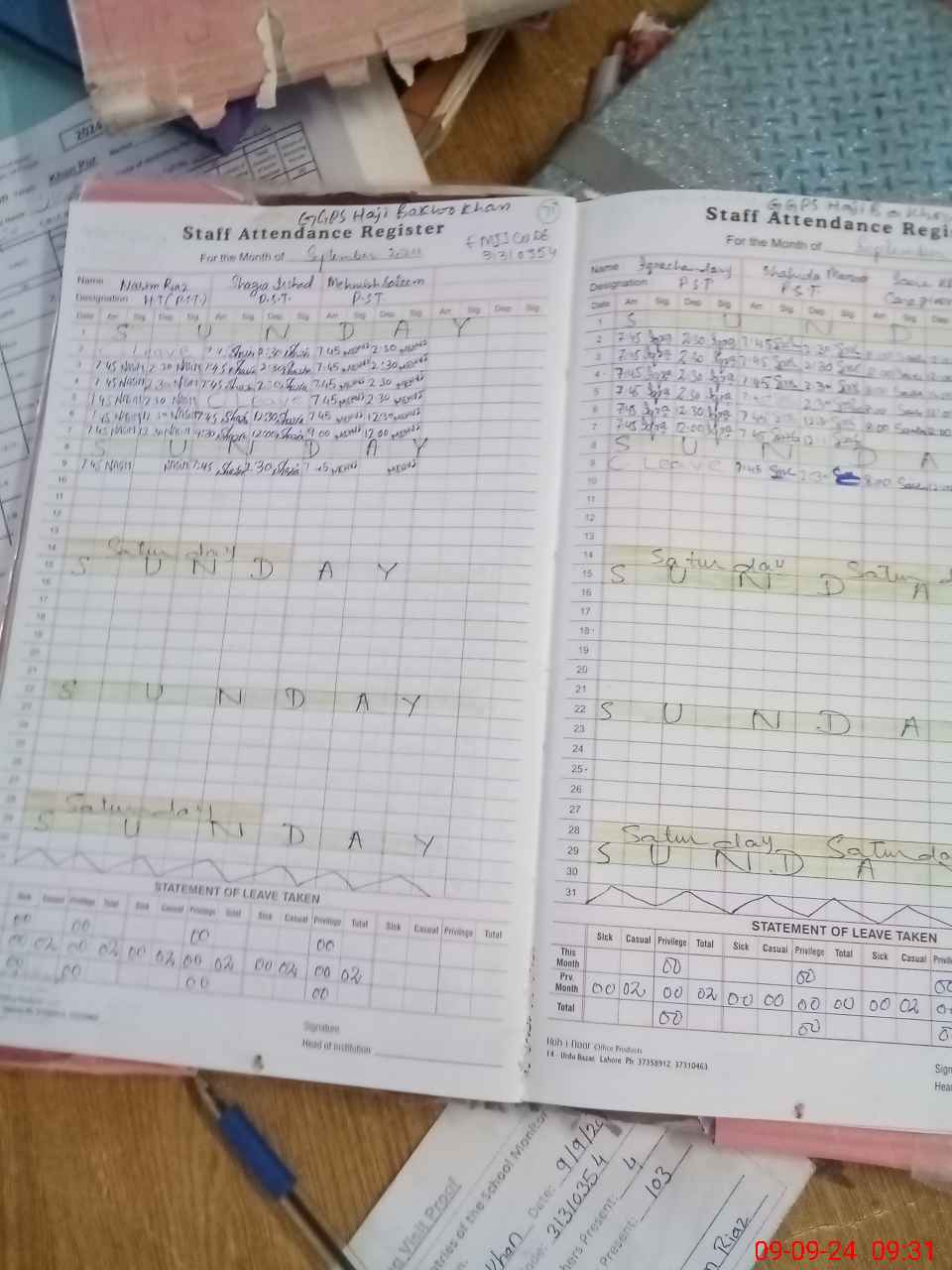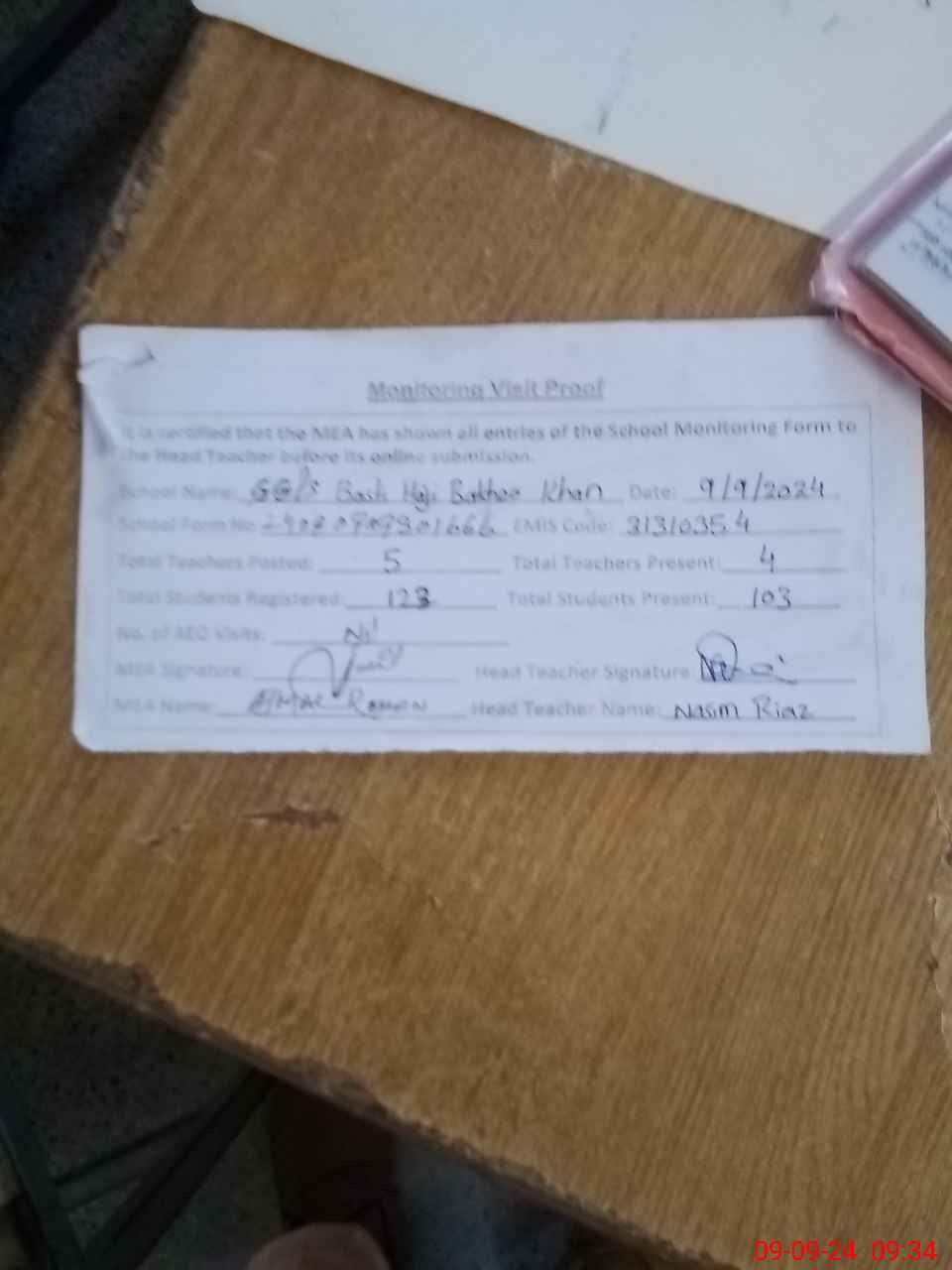 | Attendance Register | Head Teacher | MEA with School | Visit Proof |