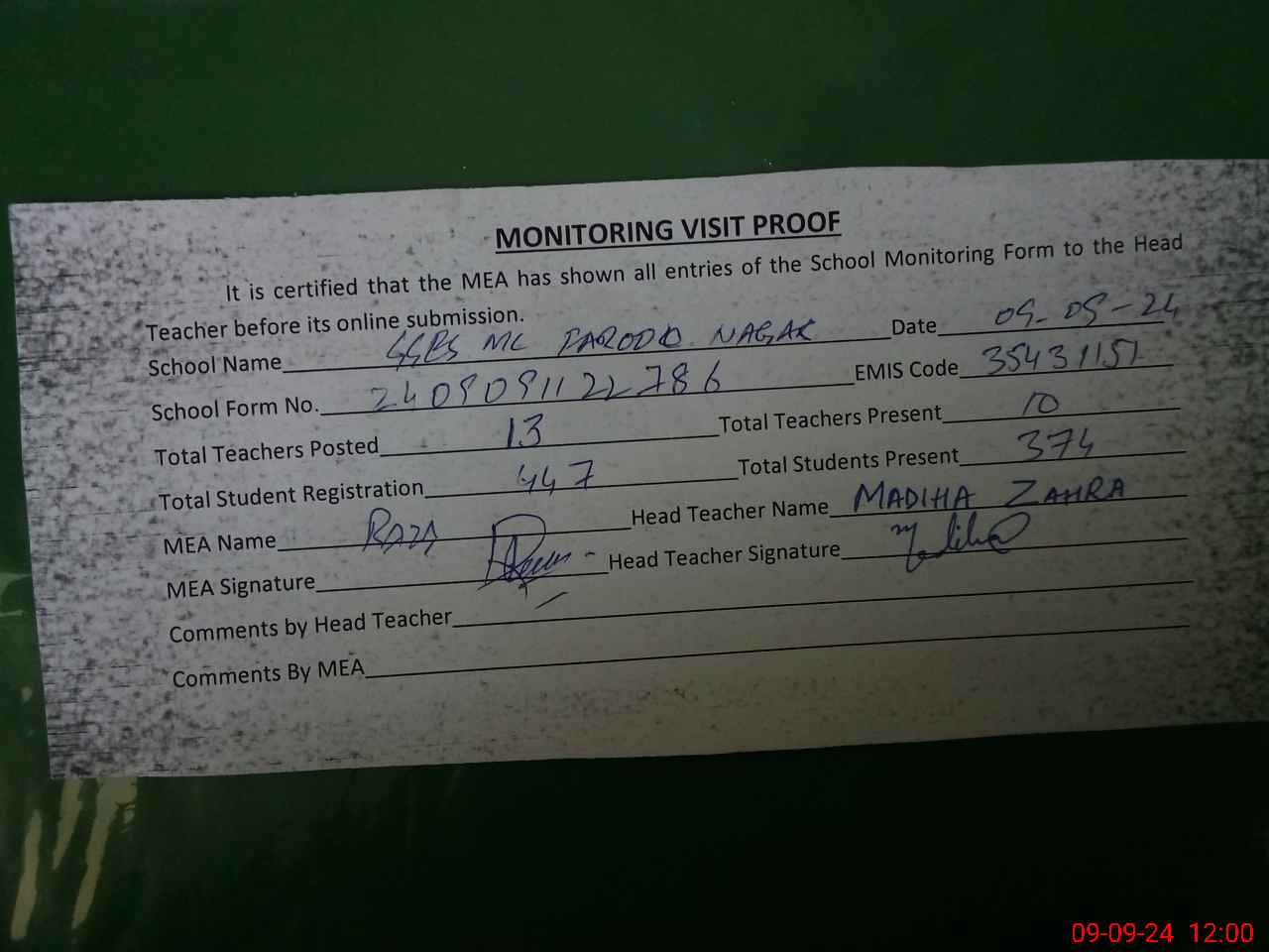 | Attendance Register | Head Teacher | MEA with School | Visit Proof |