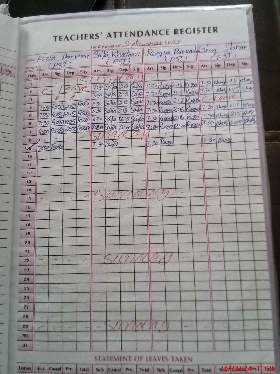 | Leave | Duty | Absent | Maternity | Medical | Ex- Pak |