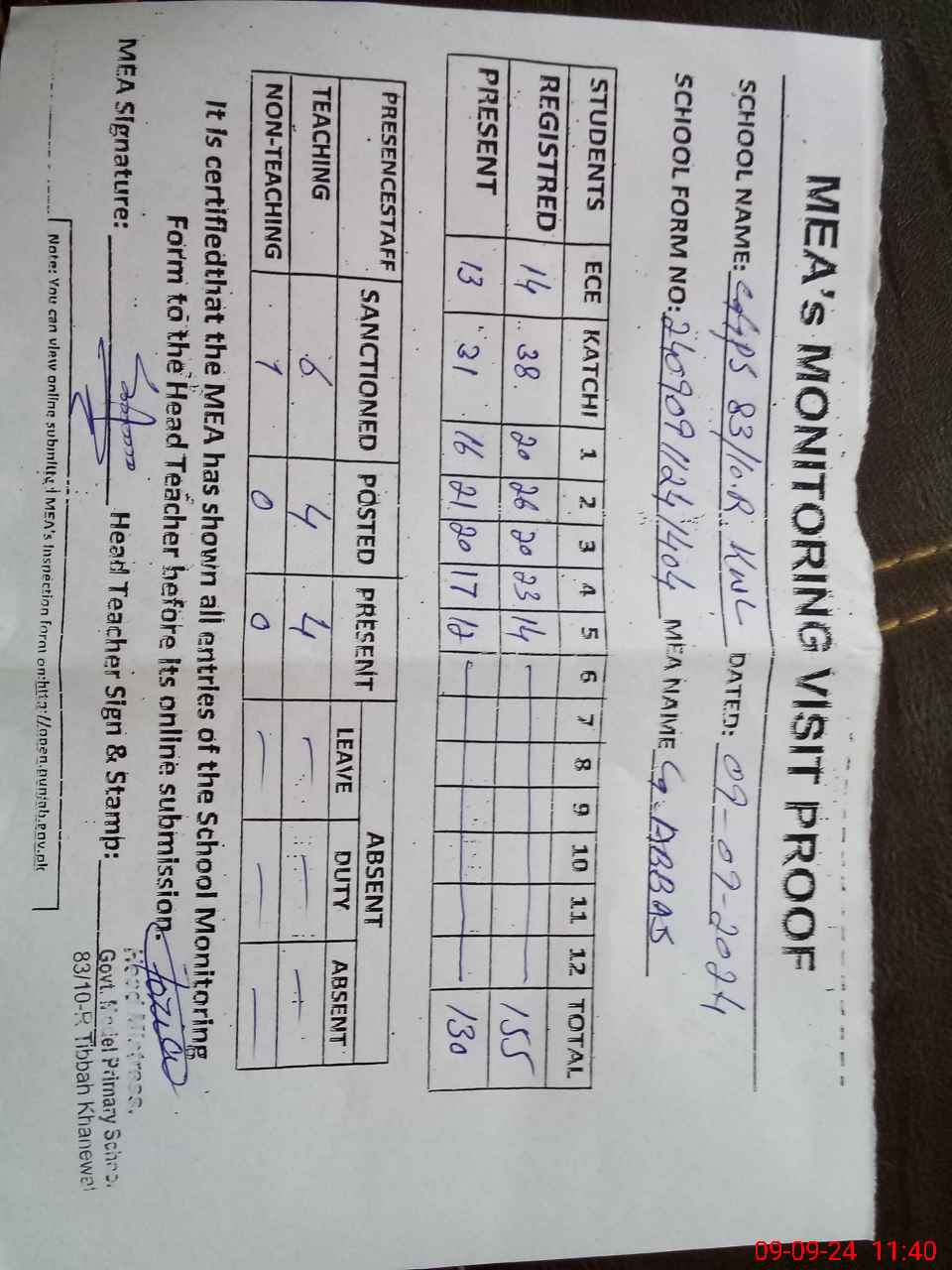 | Attendance Register | Head Teacher | MEA with School | Visit Proof |