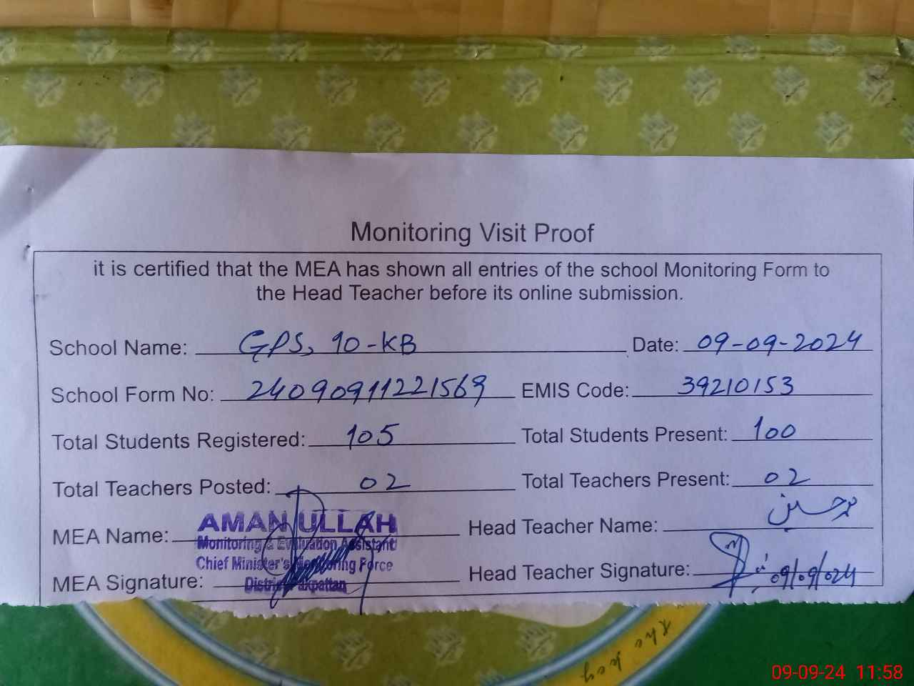 | Attendance Register | Head Teacher | MEA with School | Visit Proof |