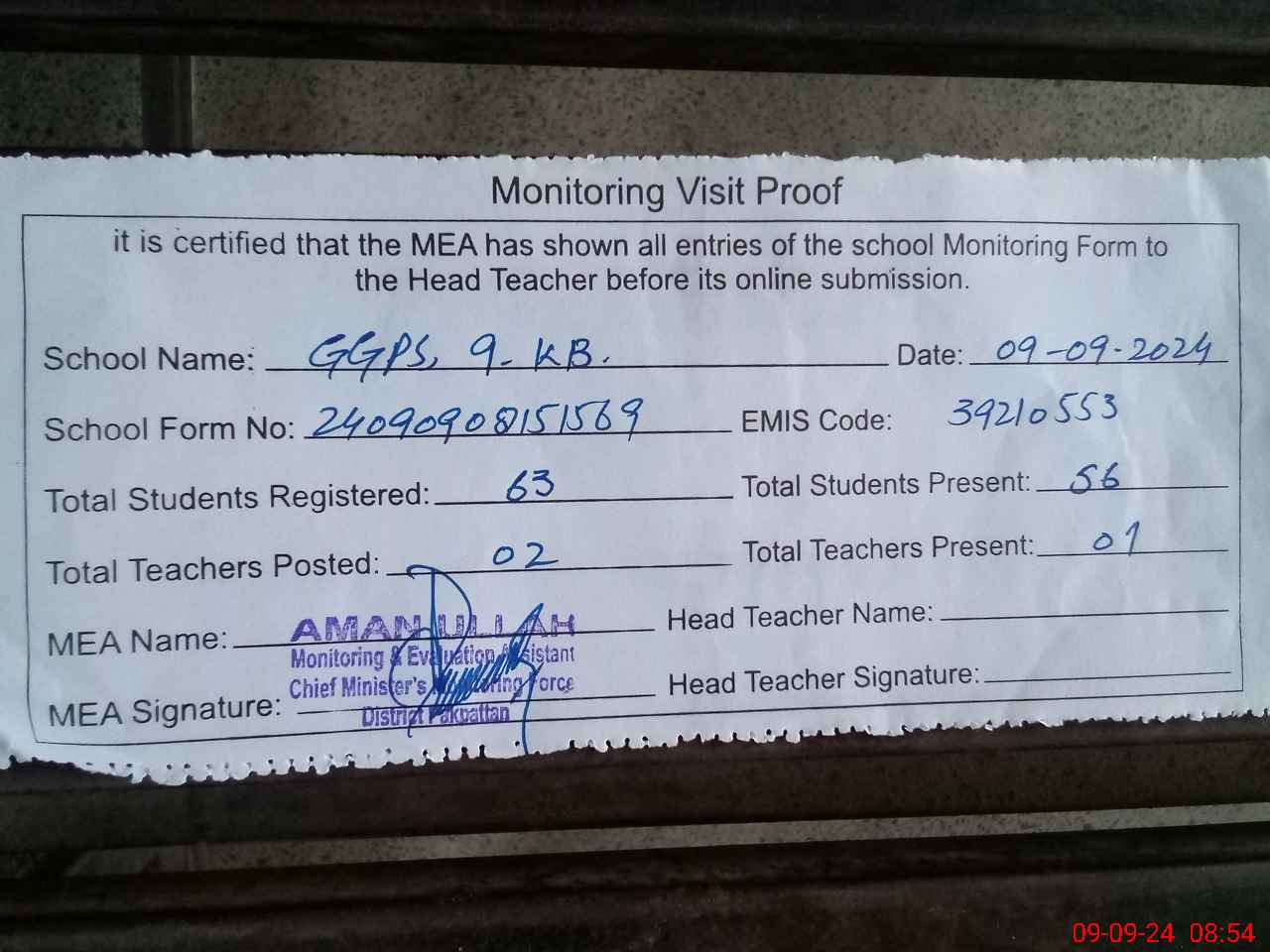 | Attendance Register | Head Teacher | MEA with School | Visit Proof |