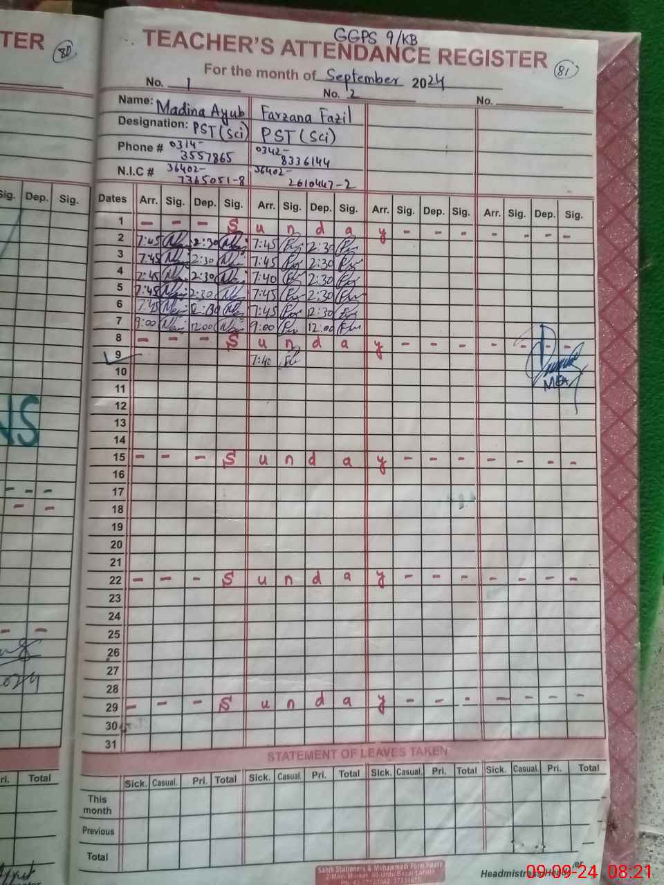 | CNIC | Full Name | Designation | R/C | Absence During Last Calender Month |