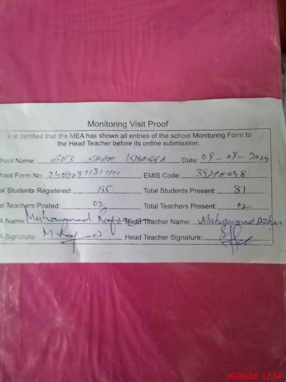 | Attendance Register | Head Teacher | MEA with School | Visit Proof |