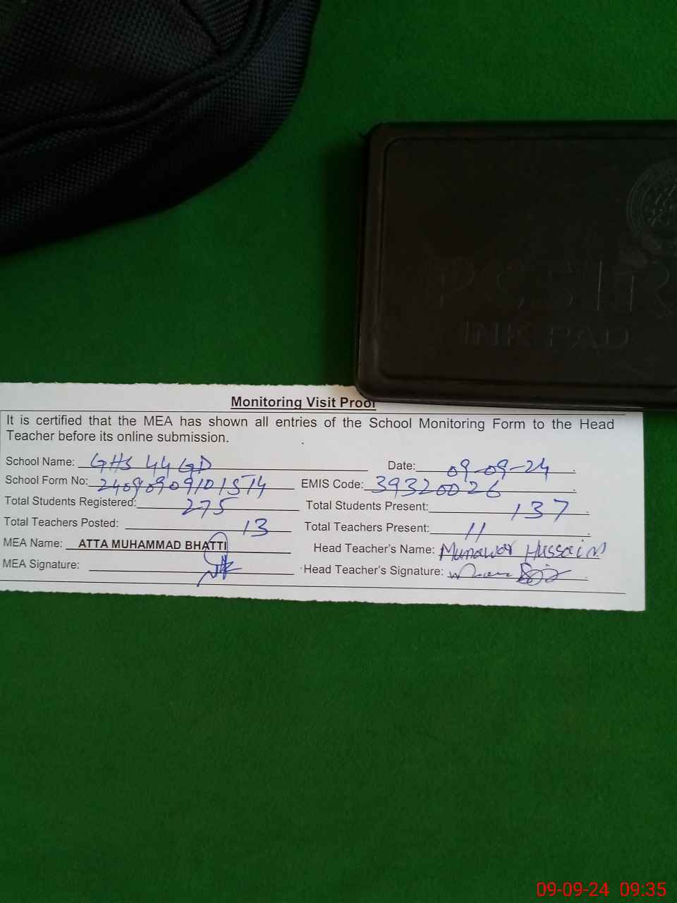 | Certified that this School was Inspected by the Undersigned MEA/DMO Today and the Information Stated Above is as Per Record. | |||||