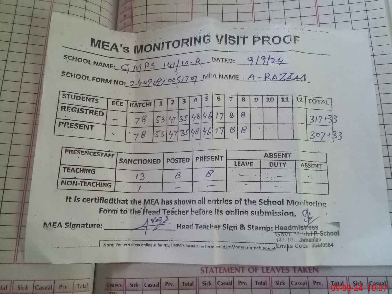 | Attendance Register | Head Teacher | MEA with School | Visit Proof |