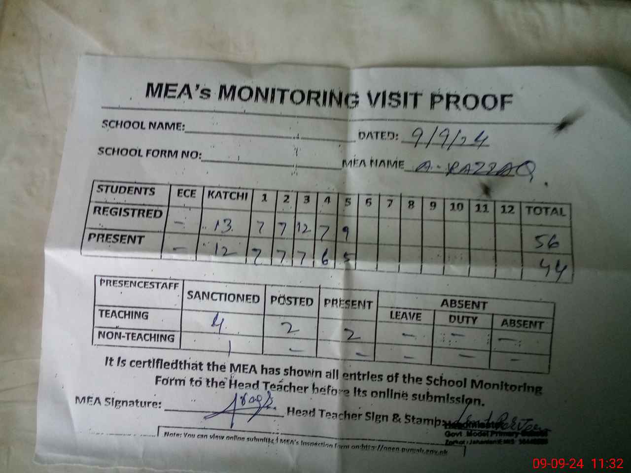 | Attendance Register | Head Teacher | MEA with School | Visit Proof |