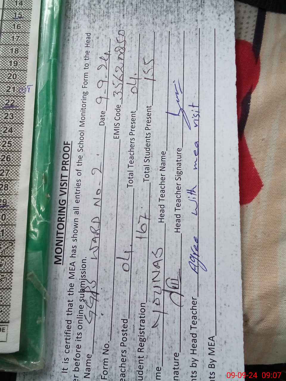 | Attendance Register | Head Teacher | MEA with School | Visit Proof |