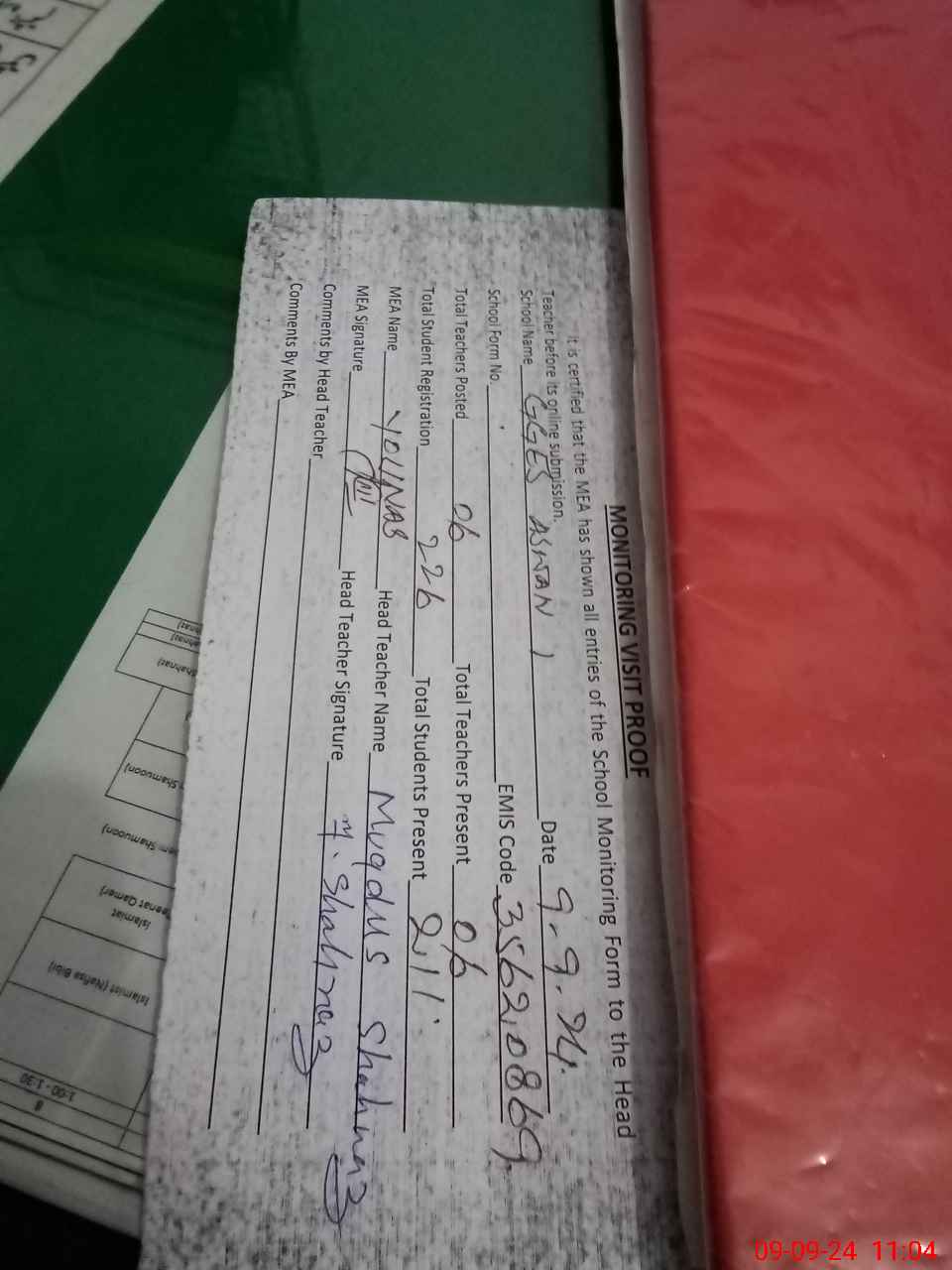 | Attendance Register | Head Teacher | MEA with School | Visit Proof |