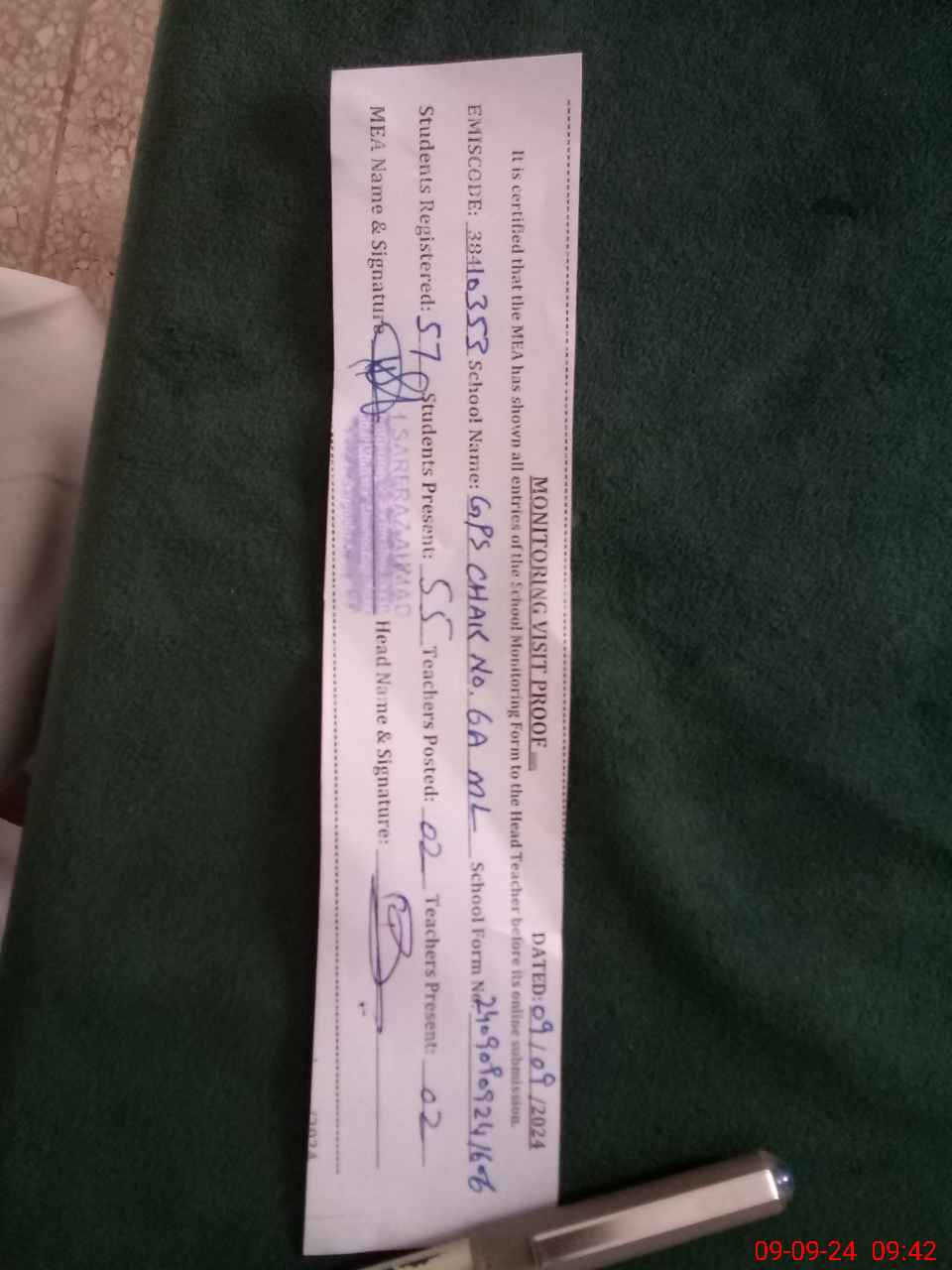 | Attendance Register | Head Teacher | MEA with School | Visit Proof |