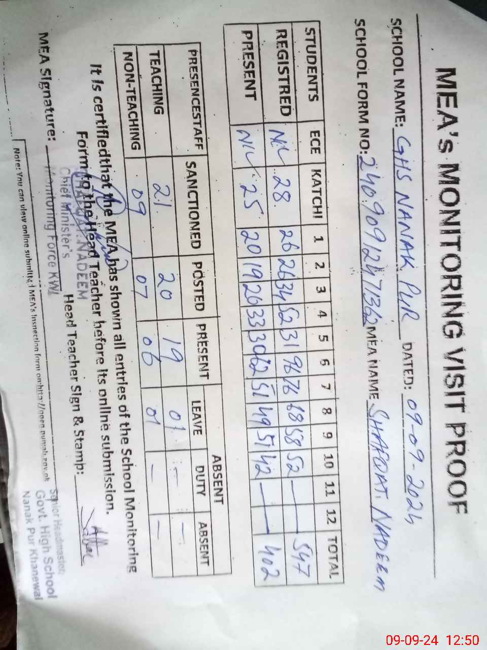 | Attendance Register | Head Teacher | MEA with School | Visit Proof |